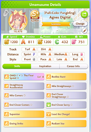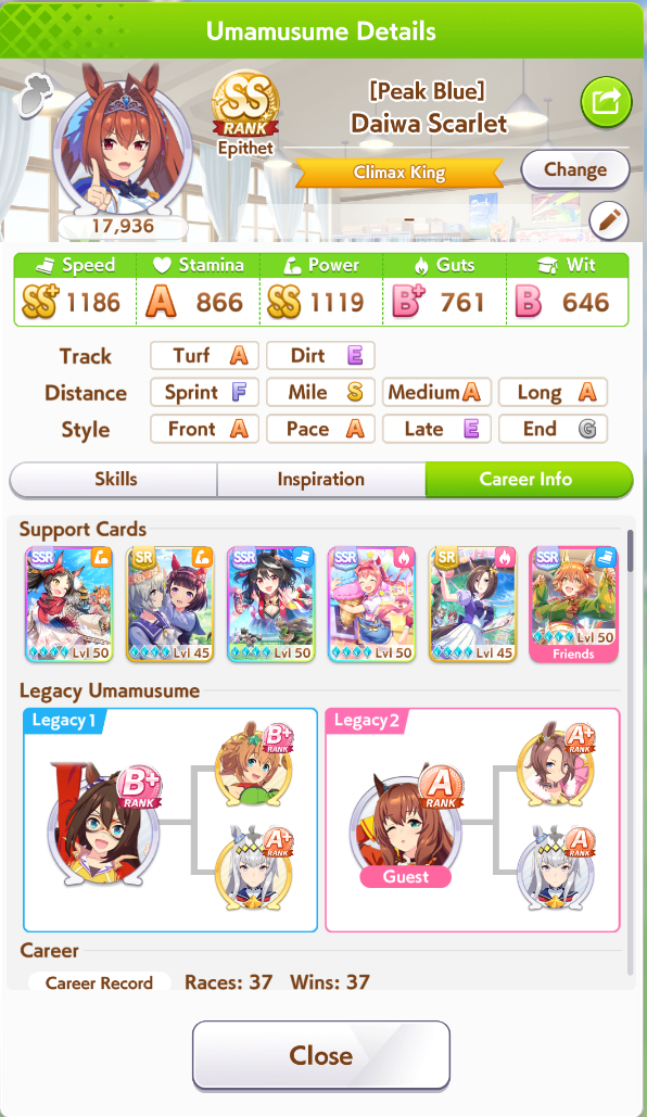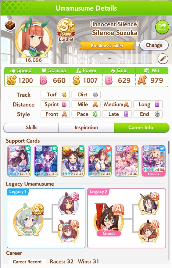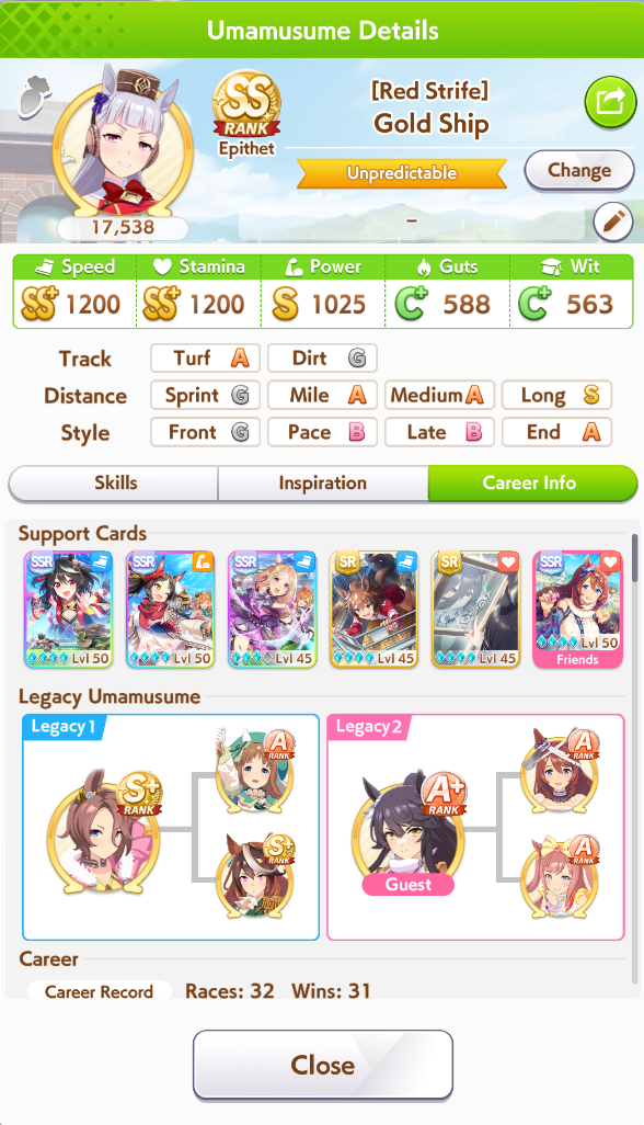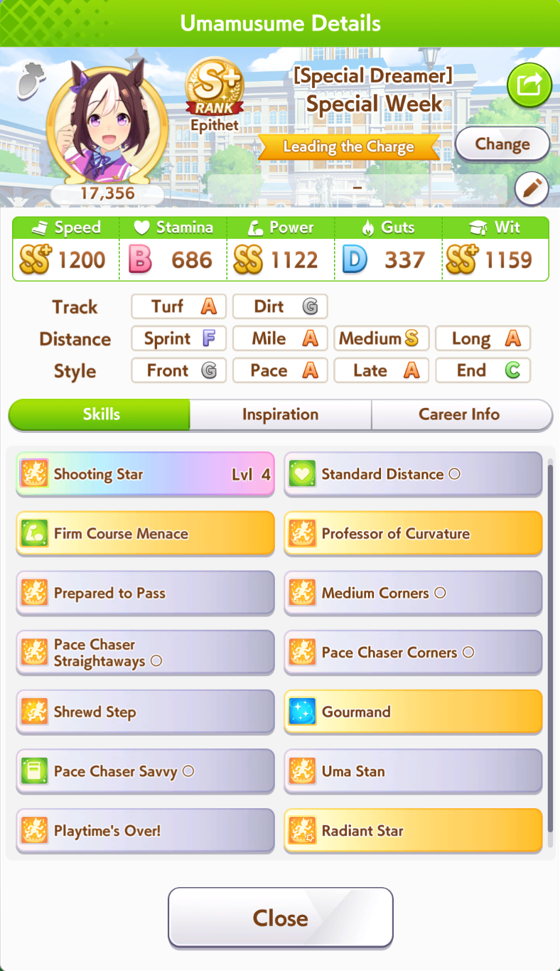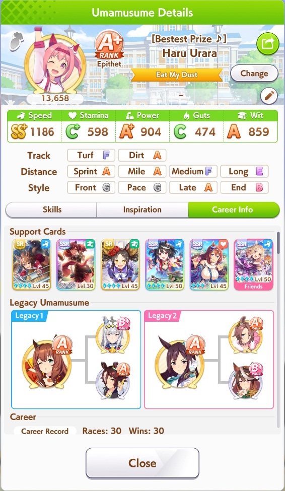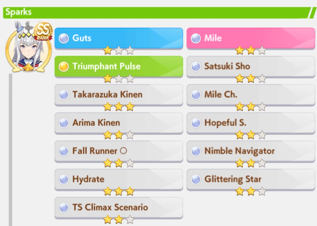 Just had a historic luckshit run wasted on a throwaway run without any good inherits and Creek busting her chain. And If I actually used hammers on all 3 Twinkle races, it could have been even slightly better.8 stam 9 pwr parents.
