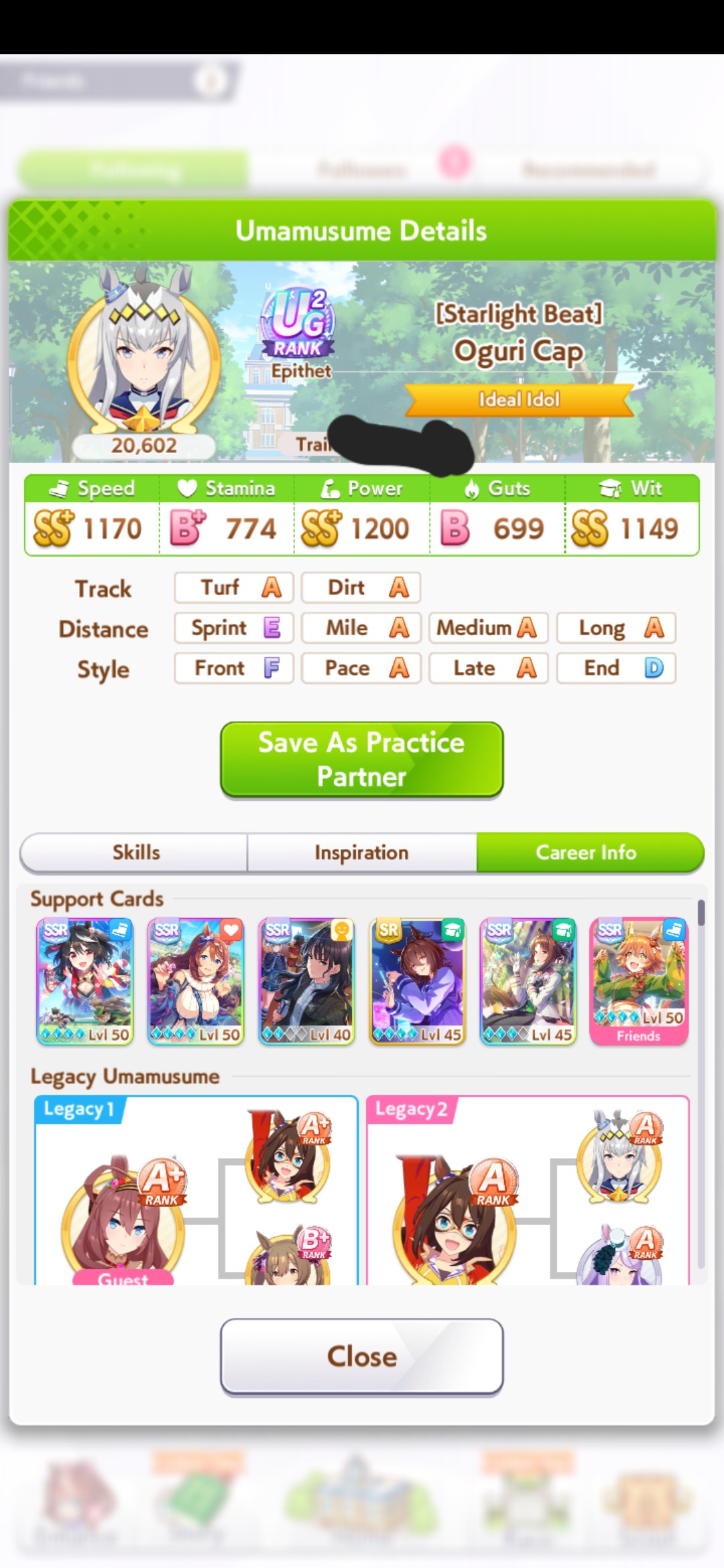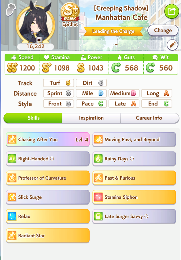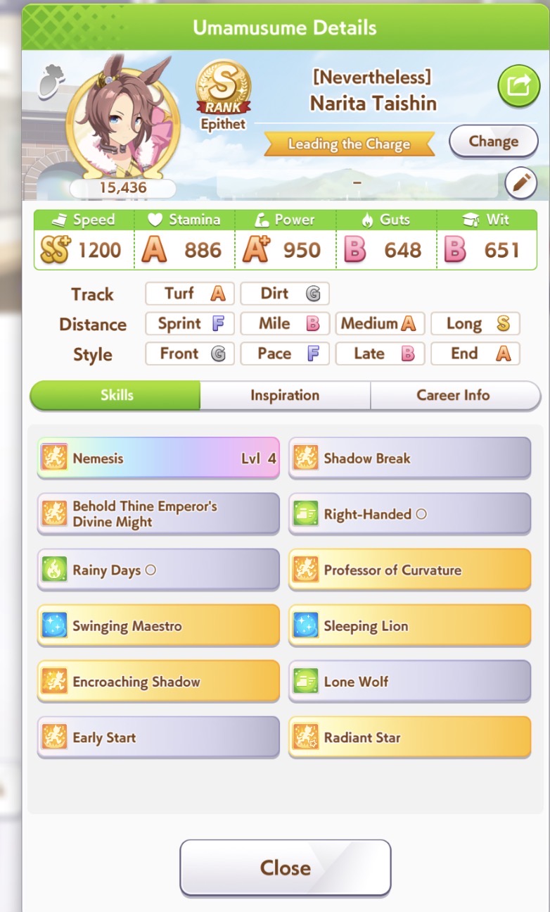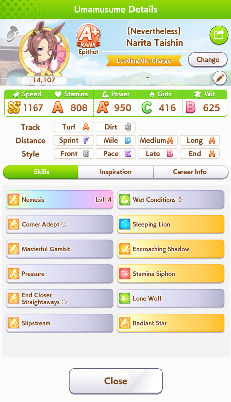 Just had a historic luckshit run wasted on a throwaway run without any good inherits and Creek busting her chain. And If I actually used hammers on all 3 Twinkle races, it could have been even slightly better.8 stam 9 pwr parents.