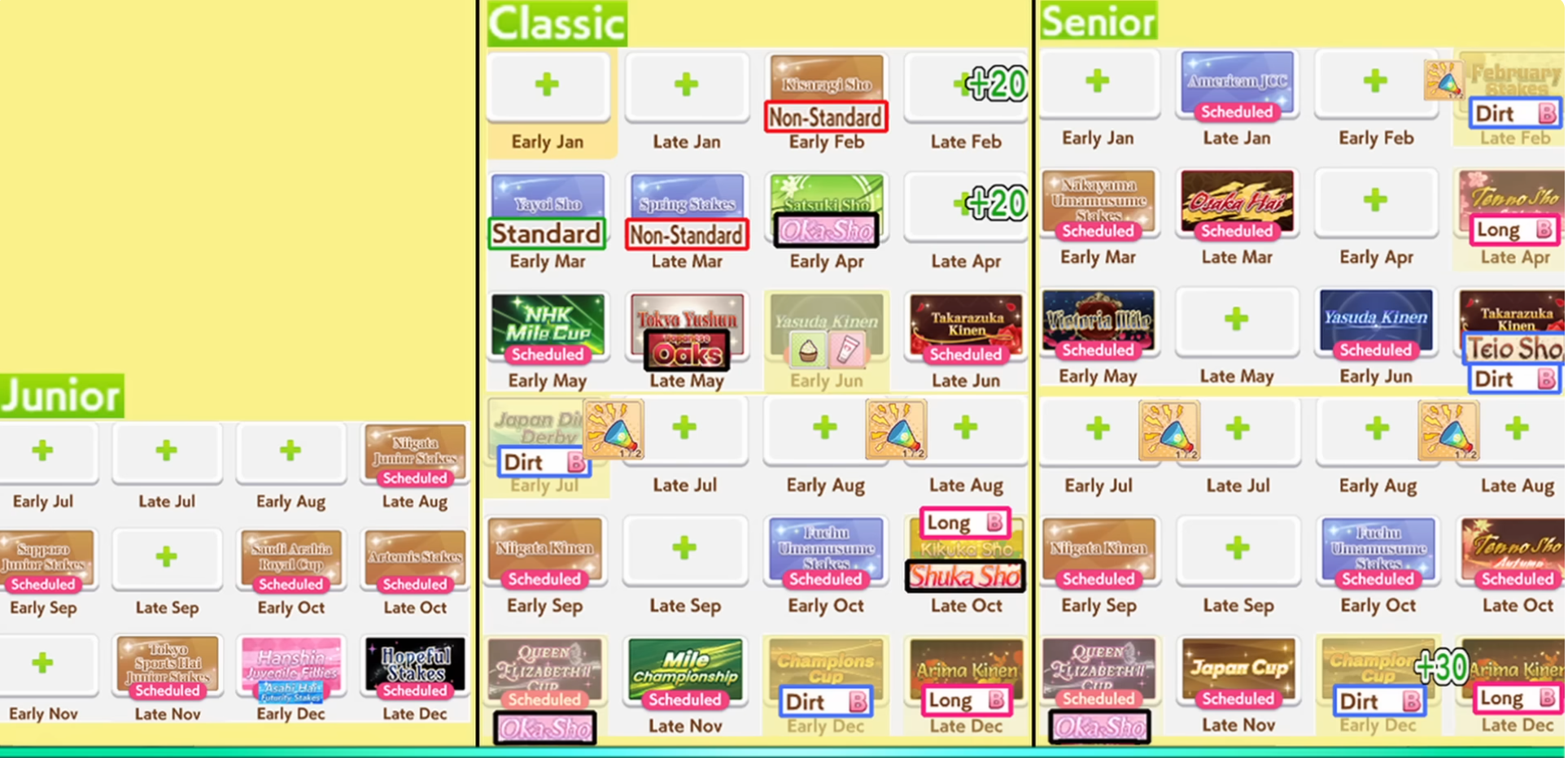 >>560505690Cross reference this with the mile to long one on here https://game8.jp/umamusume/450869. Besides the G1s pick and choose which G2s and G3s you want it in which places for training or rest purposes