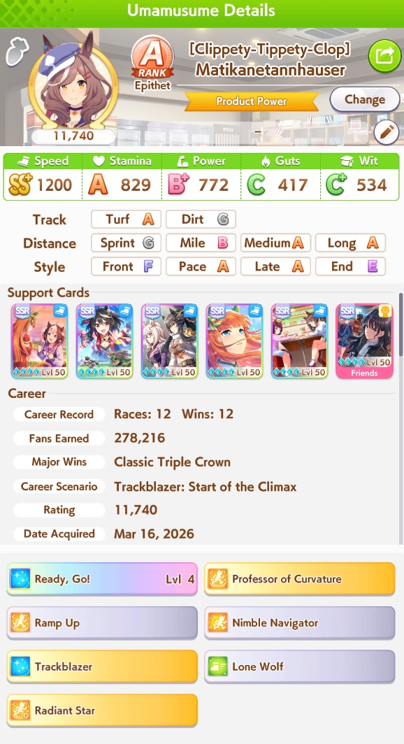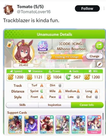 Previous: >>560487089>Global Game NewsLink your account to Cygames iDCurrent Scenario: Make A New Track aka "Trackblazer"Current Rate Up Trainee: Kitasan Black (3*), Matikanetannhauser (2*)Current Rate Up Support Cards: SSR Narita Top Road (Speed), SR Admire Vega (Guts), SR Mejiro Ryan (Stamina), SR Bakushin (Power)Current CM: Pisces Cup - Hanshin Turf 3200m03/02 - 04/14 - Halved TP Cost & 2x Career Mode Rewards03/02 - First Anniversary Part 103/05 - Admire Vega (3*), Kawakami Princess (SSR), Fine Motion (SSR)03/12 - First Anniversary Part 203/12 - 03/24 - Free Daily 10-Scouthttps://umamusume.com/news/632/03/12 - Kitasan Black (3*), Matikanetannhauser (2*), Narita Top Road (SSR)03/12 - Flying Run-Up! Story Event03/12 - Trackblazer Release date03/22 - Satono Diamond (3*), Curren Chan (SSR), Marvelous Sunday (SSR)03/23 - First Anniversary Part 403/23 - Agnes Tachyon, Narita Taishin, Narita Brian legends races03/26 - First Anniversary Part 403/26 - Mejiro Bright (3*), Curren Chan (SSR), Zenno Rob Roy (SSR)03/26 - 04/05 - Pisces Cup - Long/Right/Spring/Heavy/3200https://pages.snep.pw/uma/anni-skill-changes/>JP Game NewsCurrent Rate Up: Loves Only You (3* alt), SSR Marche LorraineNew Scenario "Beyond Dreams" releasedTimeline: https://uma.moe/timelineCygames Webstore: https://webstore.cygames.com/en/umamusume_en/>Thread Clubshttps://rentry.co/umaglobalclublistYou must be E3 (20k points) to join a circle. Apply with /uma/ or /vg/ in your profile or post ID in the thread.>All Guides & Resourceshttps://rentry.org/uma26Game databasehttps://gametora.com/umamusume (Click the gear to switch between JP / global server info)A basic guide for newfagshttps://rentry.org/umaglobalFind networks if your region is blocked from the game or clienthttps://www.umavpn.top/Seiyuu & Concertshttps://rentry.org/umstUmamusume Birthday Calendarhttps://ウマ娘.攻略.tools/events/birthdayUma Texthttps://umareader.idsmile.xyz/