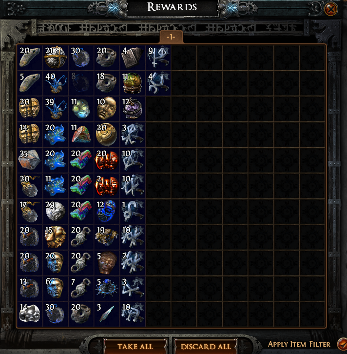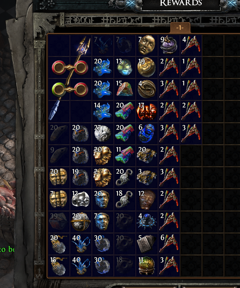 >>560509063Bull shit i run Ritual ssf..... and its not rewarding at all What to do with fucking nameless invitations ? Best my loot is 1 div 5 ancient orbs 1 omen of explosee and 2 chromatic omens.... maybe some div cards like nurse....