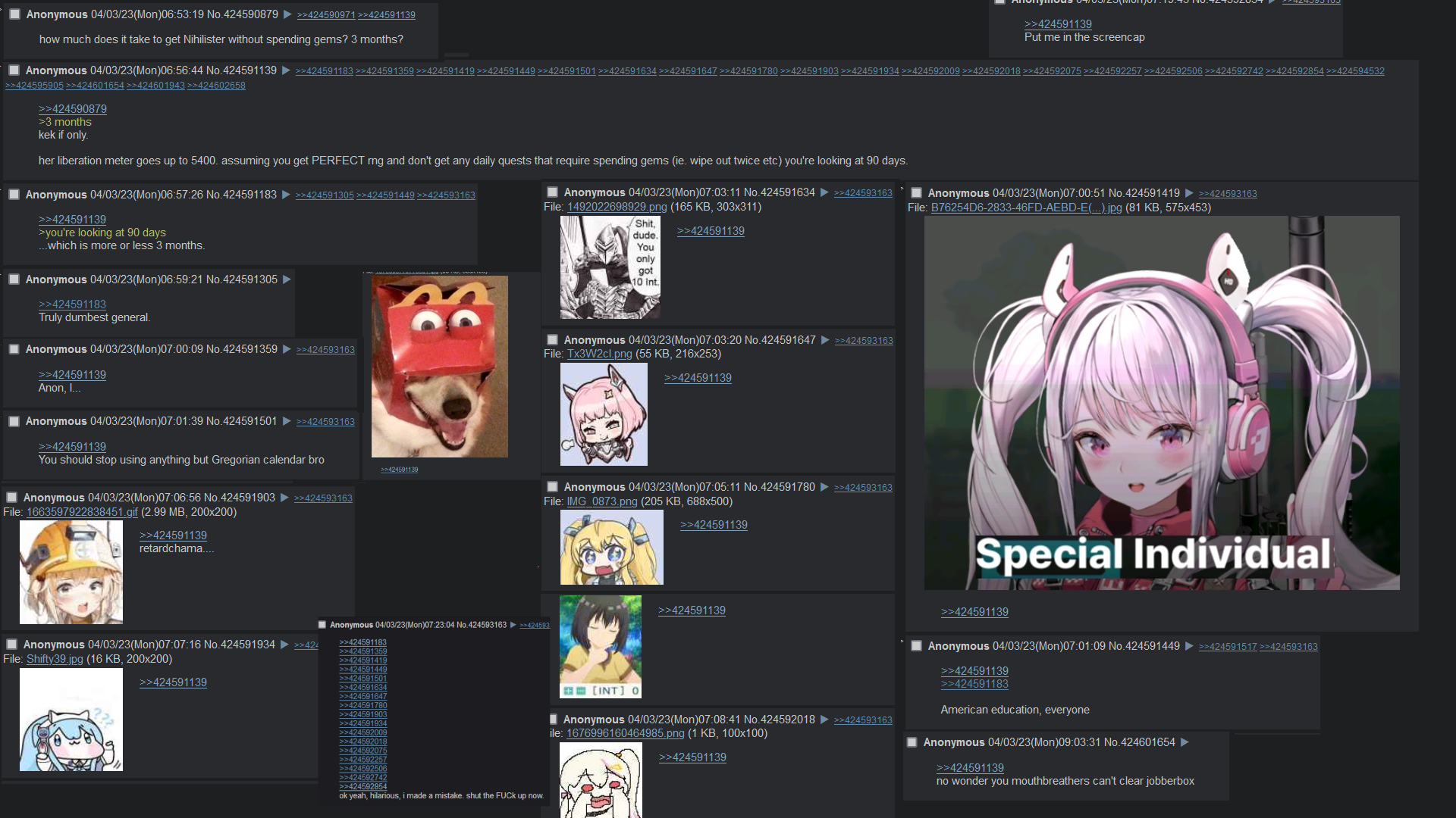 >>560546864Nihilister was an unfortunate victim of the liberation mode. When she comes back it'll be with a proper gacha alt.
