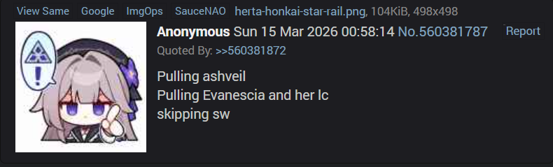 Previous: >>560507640>Version 4.1 "Unraveled for Daybreak" Special Programhttps://www.youtube.com/watch?v=TgGPAPo02pMhttps://www.youtube.com/watch?v=H97-304rAxs>Download - https://hsr.hoyoverse.com/en-us/home>4.1 Preview Page - https://act.hoyoverse.com/puzzle/hkrpg/e20260313version_1365/index.html>Version 4.1 Trailer: "Unraveled for Daybreak"https://www.youtube.com/watch?v=HqQqHgt4frUhttps://www.youtube.com/watch?v=LMt1zaLUa08>Sparxie Character Trailer: "Ravings"https://www.youtube.com/watch?v=NU6J88t4luMhttps://www.youtube.com/watch?v=AdUoc-nSB94>I'll Never Forgive Star Railhttps://www.youtube.com/watch?v=7ia3b_9-znQhttps://www.youtube.com/watch?v=gI-W8r-TWUM>Current Character Banners: Sparxie, Yao Guang, Cerydra, Rappa, Sparkle + Pela, Hanya, Qingque - https://www.hoyolab.com/article/44017918>New Drip Marketing:>Silver Wolf LV.999 (5* Imaginary Elation) - https://www.hoyolab.com/article/44129793>Evanescia (5* Physical Elation) - https://www.hoyolab.com/article/44140823>Elation Trailblazer (5* Lightning Elation) - https://www.hoyolab.com/article/44152517>Redeemable Codes - https://hsr.hoyoverse.com/gift4T28RJM4MS3BSub2SparxieMH5KCBGF3AAT45QSTARRAILGIFT>/hsrg/ Tools & Resourceshttps://rentry.org/hsrg-resources-14>/hsrg/ Thread Templatehttps://rentry.org/hsrg-thread-template-14