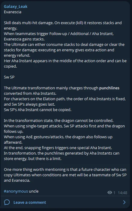 >>560531963Eva's leak sounds extremely fake, it's just Seele. SW's sounds semi-real, makes 0 sense to not get copied (if it means Yao) since Yao simply triggers all of them, unless if copy is a different mechanic. Sounds like she is a mixture of Firefly and Cassie which is possible.