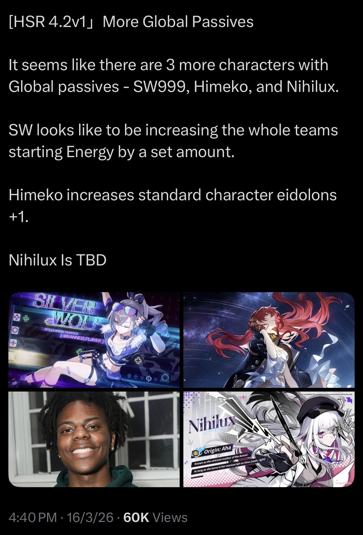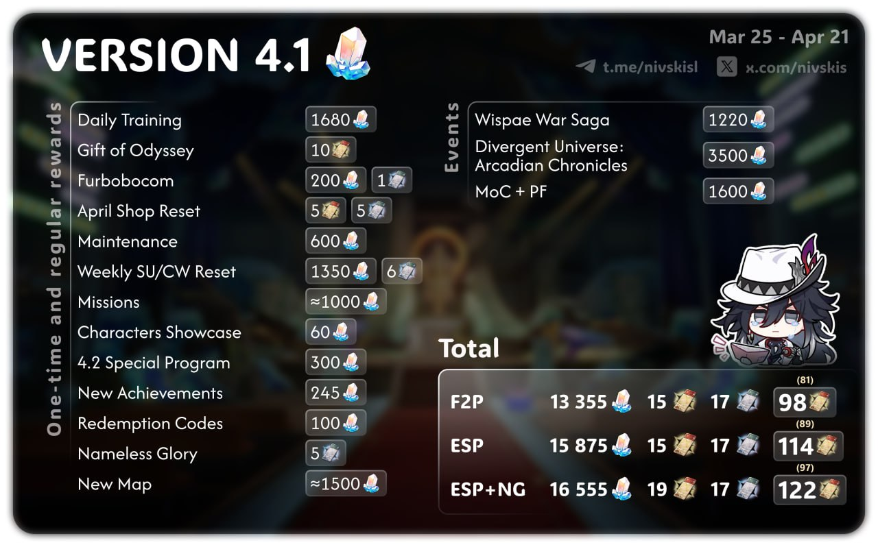 Previous: >>560519801>Version 4.1 "Unraveled for Daybreak" Special Programhttps://www.youtube.com/watch?v=TgGPAPo02pMhttps://www.youtube.com/watch?v=H97-304rAxs>Download - https://hsr.hoyoverse.com/en-us/home>4.1 Preview Page - https://act.hoyoverse.com/puzzle/hkrpg/e20260313version_1365/index.html>Version 4.1 Trailer: "Unraveled for Daybreak"https://www.youtube.com/watch?v=HqQqHgt4frUhttps://www.youtube.com/watch?v=LMt1zaLUa08>Sparxie Character Trailer: "Ravings"https://www.youtube.com/watch?v=NU6J88t4luMhttps://www.youtube.com/watch?v=AdUoc-nSB94>I'll Never Forgive Star Railhttps://www.youtube.com/watch?v=7ia3b_9-znQhttps://www.youtube.com/watch?v=gI-W8r-TWUM>Current Character Banners: Sparxie, Yao Guang, Cerydra, Rappa, Sparkle + Pela, Hanya, Qingque - https://www.hoyolab.com/article/44017918>New Drip Marketing:>Silver Wolf LV.999 (5* Imaginary Elation) - https://www.hoyolab.com/article/44129793>Evanescia (5* Physical Elation) - https://www.hoyolab.com/article/44140823>Elation Trailblazer (5* Lightning Elation) - https://www.hoyolab.com/article/44152517>Redeemable Codes - https://hsr.hoyoverse.com/gift4T28RJM4MS3BSub2SparxieMH5KCBGF3AAT45QSTARRAILGIFT>/hsrg/ Tools & Resourceshttps://rentry.org/hsrg-resources-14>/hsrg/ Thread Templatehttps://rentry.org/hsrg-thread-template-14