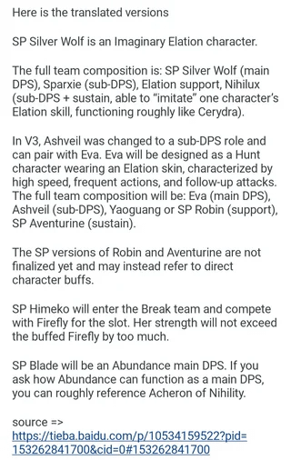 If silver wolf is a transformation carry I don't really see the point of sparxie generating all those punchlines.>You generate a fuck ton of punchlines to charge your ult>wolfie transforms>you now have a sparxie shaped brick on your team that gives dogshit buffs until the transformation ends.Seems very similar to>Sunday helps phainon open his ultimate fast>Phainon transforms>you now have a useless offield sunday giving dogshit buffs and can't press AA in phainon's ultimate