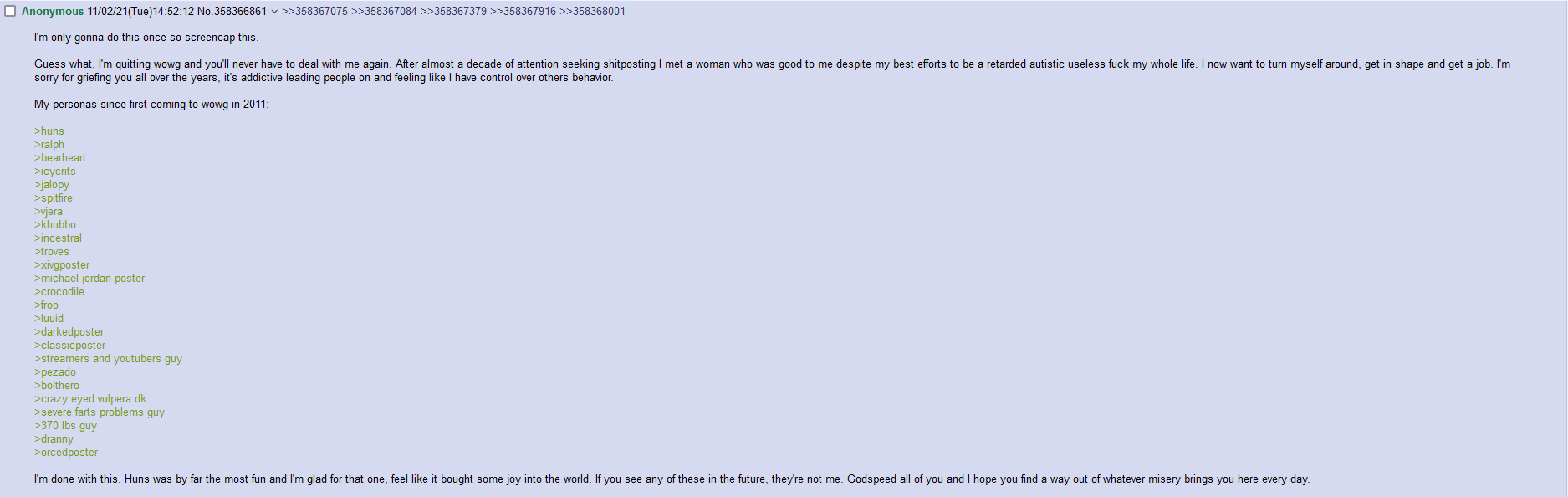 >>560560960old wowg>avatarfag posts screenshot of their fempanda>one person replies "kys furfag">the endnew wowg>someone posts anything>one person replies OHOHOHO YOU MUST SECRETLY BE AVATARFAG 1 2 OR 3, LET ME WRITE A PARAGRAPH ABOUT DISCORD DRAMA AND MY OPINIONS ABOUT THESE RANDOM PEOPLE THAT EVERYONE OBVIOUSLY KNOWS ABOUT>10 replies telling that guy to shut the fuck up>constant back and forth bickering about who is "right" and who is "ruining the thread"this exact scenario happened in the replies to your post already lol