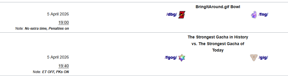 Previous: >>560372001>What... is this?Put simply, a simulation of Pro Evolution Soccer being competed between teams which are embodiments of boards of the 4chan imageboard. The players represent facets of each board's culture. All of the matches are AI versus AI. However, humans "manage" each team, creating their tactics and giving input during games as they happen to make substitutions and tactical changes as they see fit.https://implyingrigged.info/wiki/FAQ>Where can I watch the cup?https://isthisliv.com/4cc/stream.html>Ongoing Invitationalshttps://implyingrigged.info/wiki/2026_4chan_Spring_Friendlies>Upcoming Cupshttps://implyingrigged.info/wiki/2026_4chan_Spring_Babby_Cuphttps://implyingrigged.info/wiki/2026_4chan_Summer_Cup>Upcoming Invitationalshttps://implyingrigged.info/wiki//vg/_League_26_Enemylieshttps://implyingrigged.info/wiki/Very_Genuine_and_Legit_Vidya_Game_Leaguehttps://implyingrigged.info/wiki/Test_Cup_V_18.1https://implyingrigged.info/wiki/2026_4CC_Champions_Leaguehttps://implyingrigged.info/wiki//ag/_League_9/11:_Never_Forgethttps://implyingrigged.info/wiki/Beta_Bowl_4>Wiki:https://implyingrigged.info/wiki/Main_Page>Sekkrit Code37pebis>DLC Passworddivegrass>Booruhttps://isthisliv.com/booru/>Archivehttps://implying.fun/>Other videoshttps://implyingrigged.info/wiki/Videos>PES Infohttps://implyingrigged.info/wiki/Pro_Evolution_Soccer_2015https://implyingrigged.info/wiki/Pro_Evolution_Soccer_2021>Previously2huwinslol343winslolenemyliesEXILEDbellum the FORSAKENshitposting