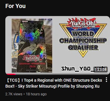 #6784 - Kaijukratops EditionPrevious: >>560484852>SimulatorsAutomated:●EDOPro (PC/Android): https://projectignis.github.io/download.html●Master Duel (Multi-plat): https://store.steampowered.com/app/1449850Manual:●Duelingbook (online): https://www.duelingbook.comTag: “/dng/” Password: “vidya”; on EDOPro, specify server.Genesys Duels: MR5, TCG, Custom Rules: No Links/Pend/EMZ/Pend Zones>LinksRulebook: https://www.yugioh-card.com/en/rulebook/Wiki: https://yugipedia.comProbability Calculator: https://yugioh.fyiStock Market: https://yugiohprices.comDatabase: https://www.db.yugioh-card.comMisc Info: https://www.formatlibrary.comBlog:https://yugiohblog.konami.com/Alt Format:https://www.yugioh-card.com/en/genesys/>BanlistsTCG: https://www.yugioh-card.com/en/limited/list_2026-02-02/ (Feb 2/Next List: TBA)OCG: https://yu-gi-oh.jp/news_detail.php?page=details&id=2406 (Jan 1/Next List: April 1)>DecklistsOCG: https://roadoftheking.com https://tonamel.com/competitions?game=yugioh_ocgTCG: https://ygoprodeck.com/category/decks/tournament-meta-decks>NewsJP: https://yugioh-starlight.comEN: https://ygorganization.com>Upcoming SetsOCG:●Valuable Book EX6 (Mar 19)●LIMIT OVER COLLECTION -THE RIVALS- (Mar 20)●Chaos Origin (Apr 25)●REVOLUTION BOOSTER -Toon Witchcraft (May 30)●World Premiere Pack 2026 (Jun 27)●Beyond the Brave (July 18)●Deluxe Duel Set - Sky Striker (Late Aug)TCG:●Rarity Collection 5 (Apr 10/Apr 17 for NA/LATAM)●Blazing Dominion (May 8)●Battle of Legends: Glorious Gallery (Jun 5)>Events●Chaos Progression (Apr 5, 2000 UTC):https://challonge.com/DNGChaosProgression1