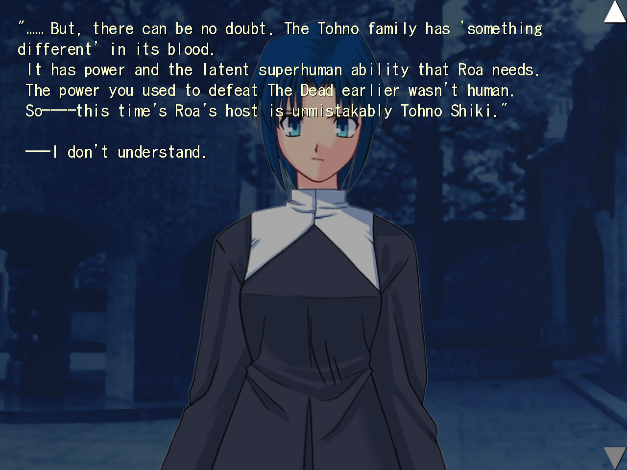 I already got spoiled on Akiha being NBR, so I'm fairly confident that Shiki isn't actually a Tohno by blood, and the real one died(?) 8 years ago. Even without that spoiler Arcueid heavily implied the same thing pretty early.