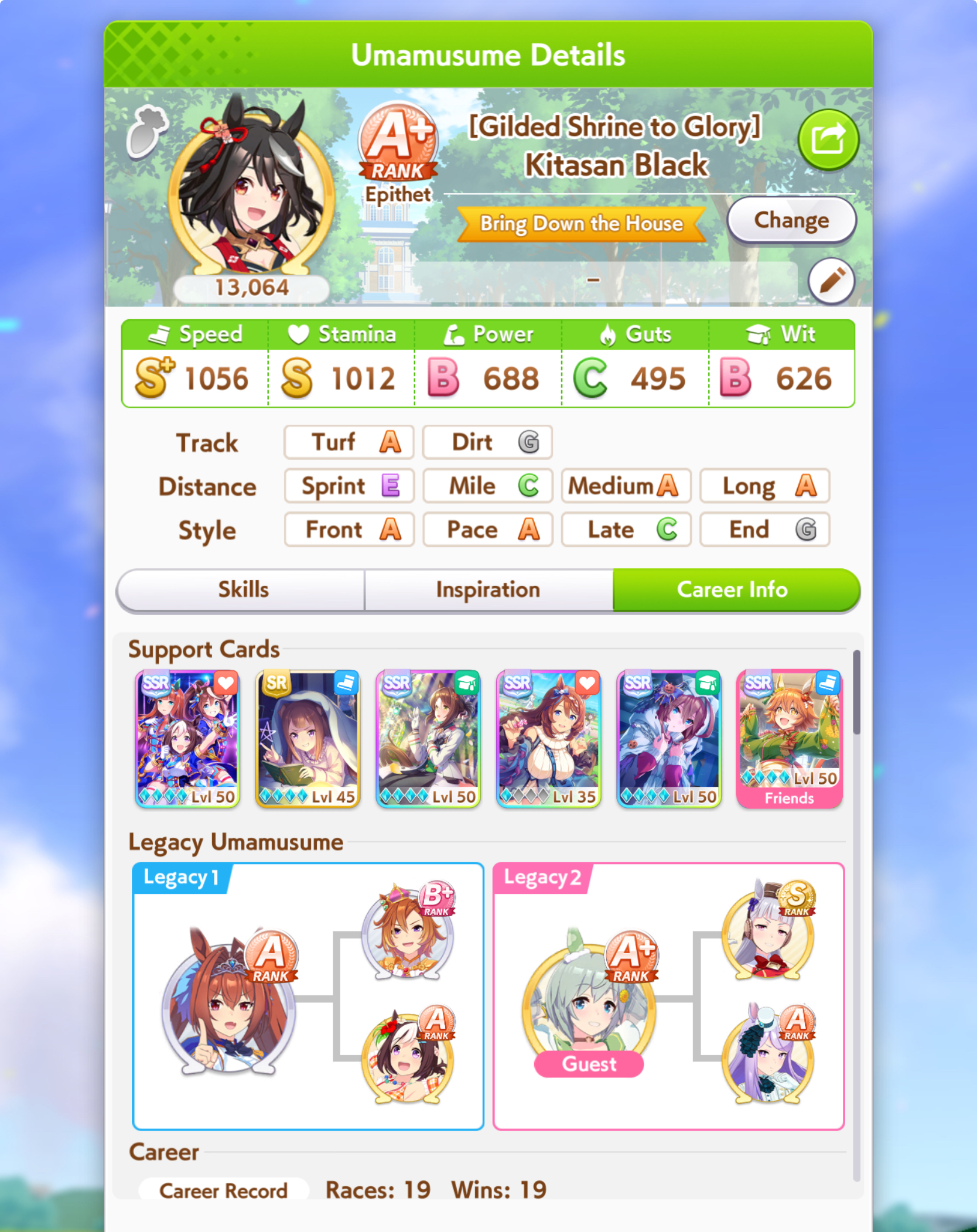 Current Rate Up Support Cards: SSR Narita Top Road (Speed), SR Admire Vega (Guts), SR Mejiro Ryan (Stamina), SR Bakushin (Power)