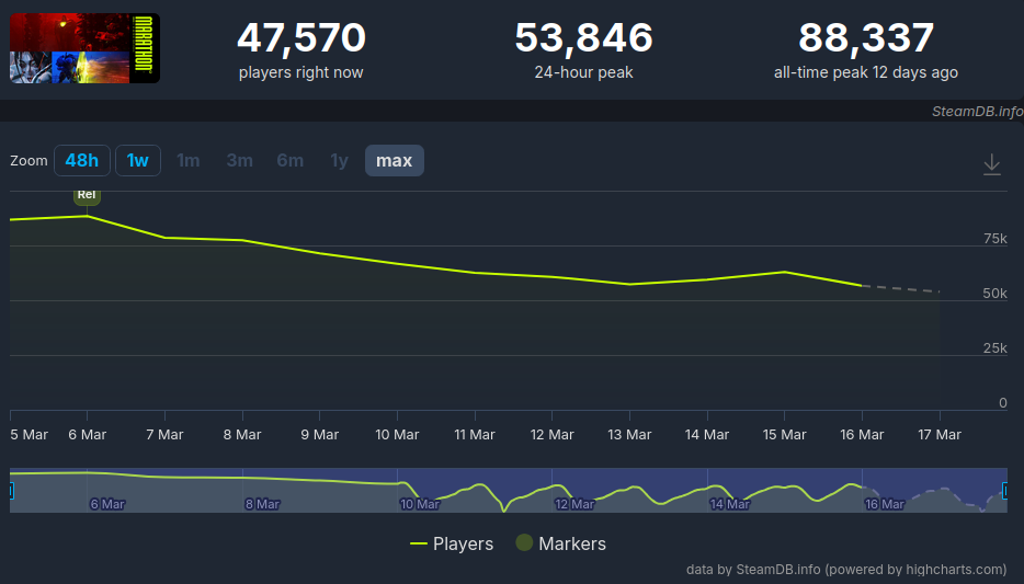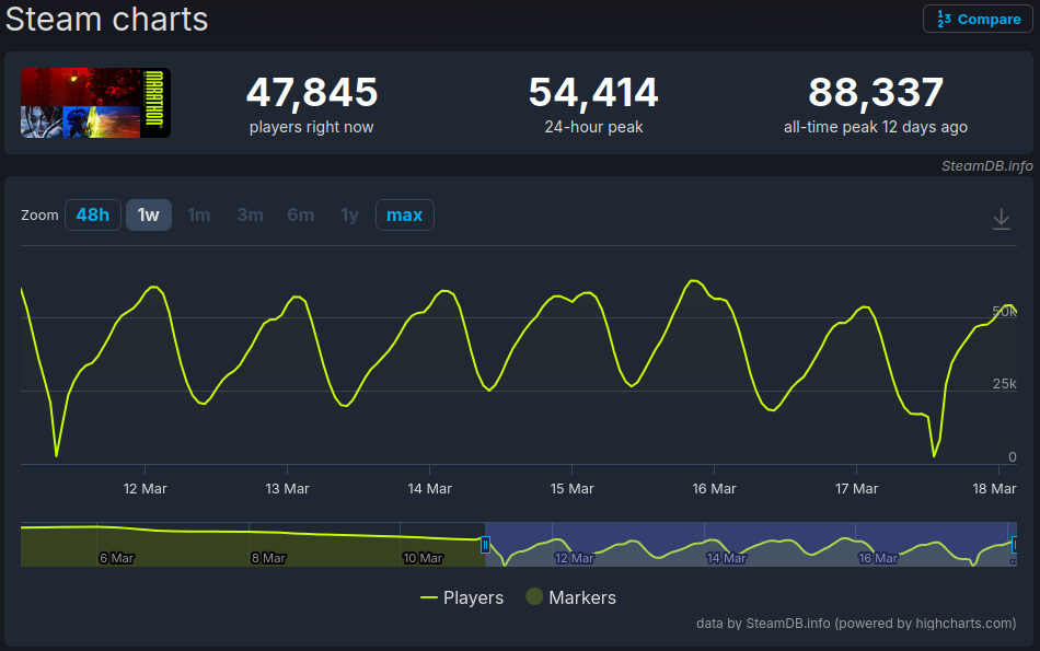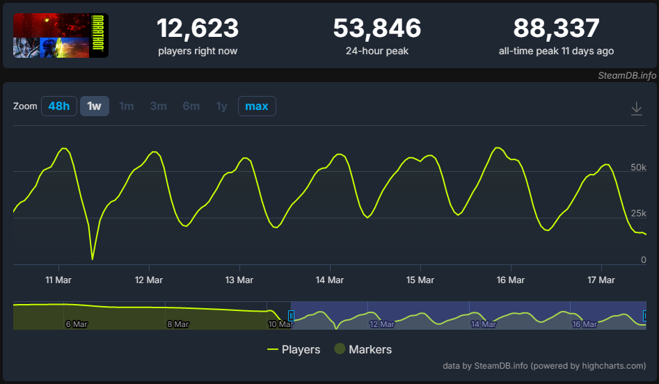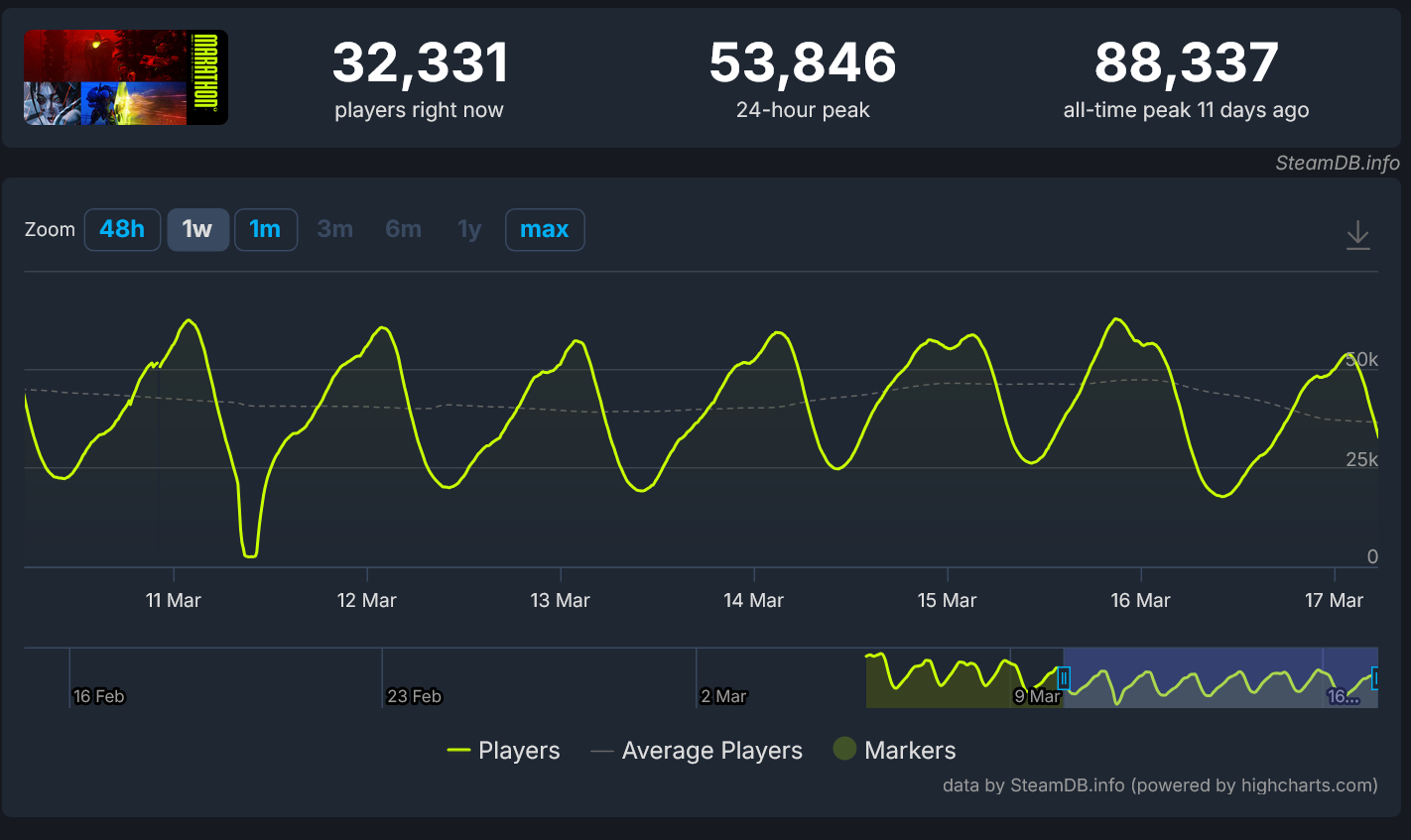 Not really a chart poster and I've been enjoying aspects of Marathon, but I quickly checked the steam charts for today and my jaw dropped, instantly thought of you guys.>10k peak hour player drop right after a big streamer event>new low at off night hoursUnironically feel like I wasted 40 bucks, this game is dying.