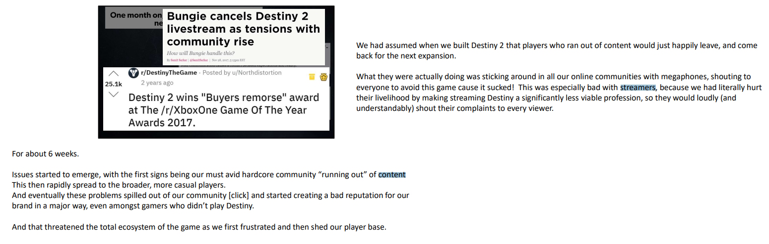 >>560597417>"designed in a way... to slow us down">"not enough information start deciphering">"most of the puzzles have been brute forced"Sounds like Destiny day one raids in a nutshell but now exasperated into being the norm for the base game play. I'd feel sorry for them, if it wasn't so comically ironic.