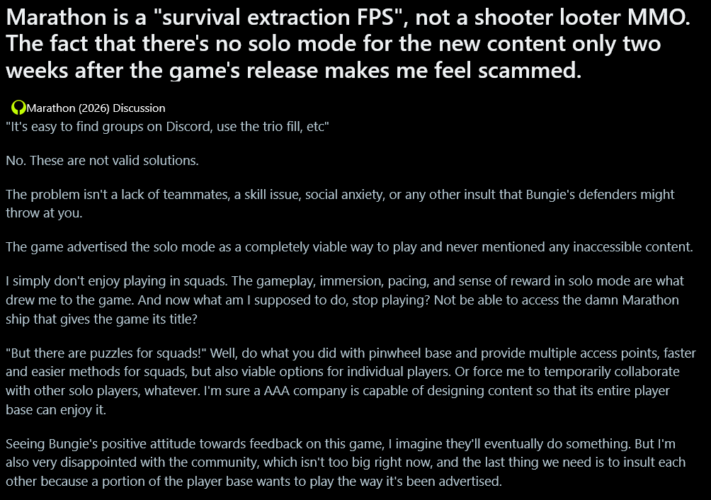 >>560583991If only the same effort they put into marketing into listening to feedback and ACTUALLY IMPROVING THEIR FUCKING GAMES. People hate shit like the Portal and even people that like Marathon hate how the game is such a sweatfest due to PvP which makes exfiling a pain in the ass. Not to mention that people have been begging for Bungie to add in a campaign or even PvE only stuff to Marathon ever since it was announced.