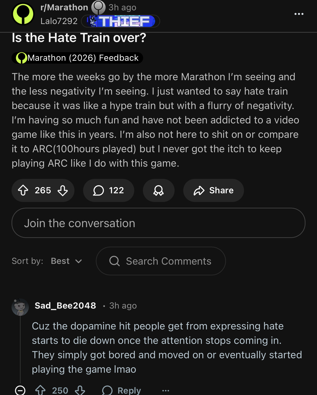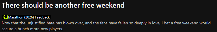 >>560601473The first 5 quote are from gaming outlets, but the last two are from streamers like Shroud and Burnt Peanut. It was also dumb to do a drip feed of content instead of making sure there was enough worthwhile at launch because people probably aren’t even aware that Marathon launched because there was new reviews, and now they’ll play Crimson Desert instead.