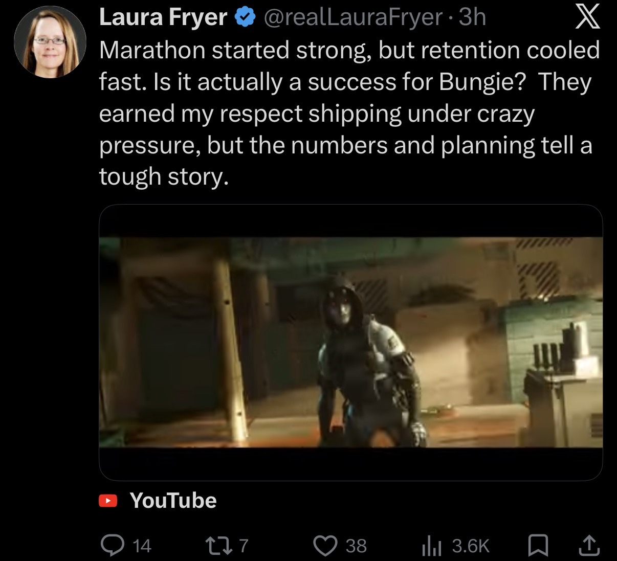 >>560778712is this thinly veiled shill cope? She still shits on Marathon and says it might not be able to cover for Bungie's expenses.