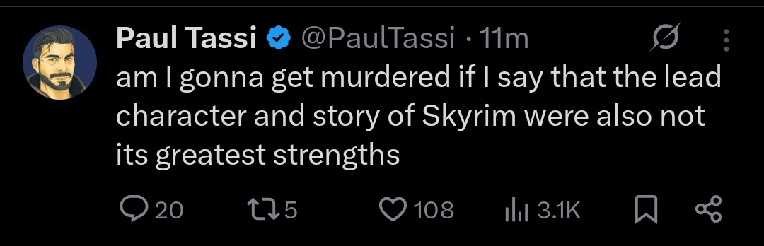>>560794834>Open xitter>Immediately see him trying to put down Skyrim for some reason to defend crimson desertBungo simply aren't paying the bills anymore so he has to go and be retarded for anyone who'll pay
