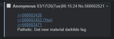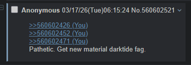 >>560602426>>560602452>>560602471>Instantly defensive LMAO DEAD DARKTIDE GENERAL SHITPOSTERS HAHAHAHAHAH