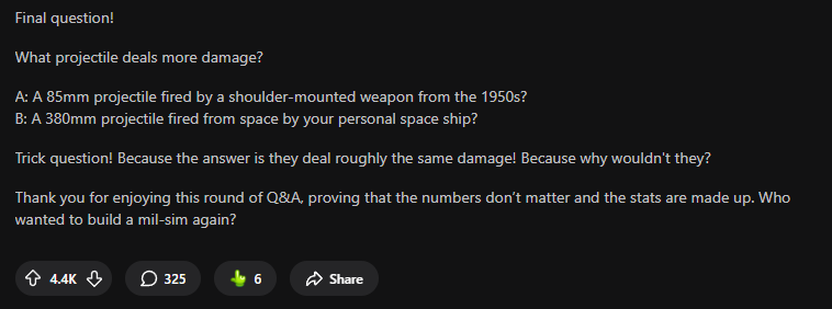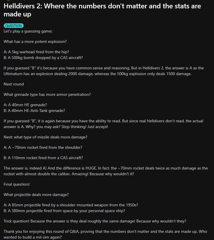 >>560617614>Helldivers 2 is inspired by games like Arma and escape from Tarkov and Helldivers 2 is nothing like either of themThe sad thing is that I can kinda see the vision. If everyone communicates well and you assign each member specific roles like chaff clearer or anti-tank, you can sort of get that military sim roleplay going on. The problem is that it's just more consistent for everyone to have a generalist build that can do everything.