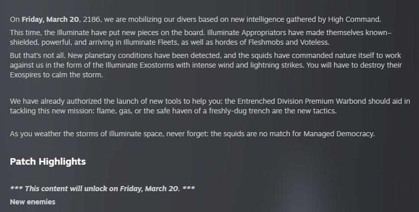 >stayed late for the update>game updates>open game>no new warbond>no new items in the store>no new squids>no new missionsepic