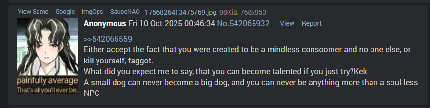 I lament the fact my writing ability is wasted entirely on shitposts that garner no (you)'s.Yet I would change nothing because it is fun and fun for fun's sake is how we remain human in a world of absurdity and cruelty.