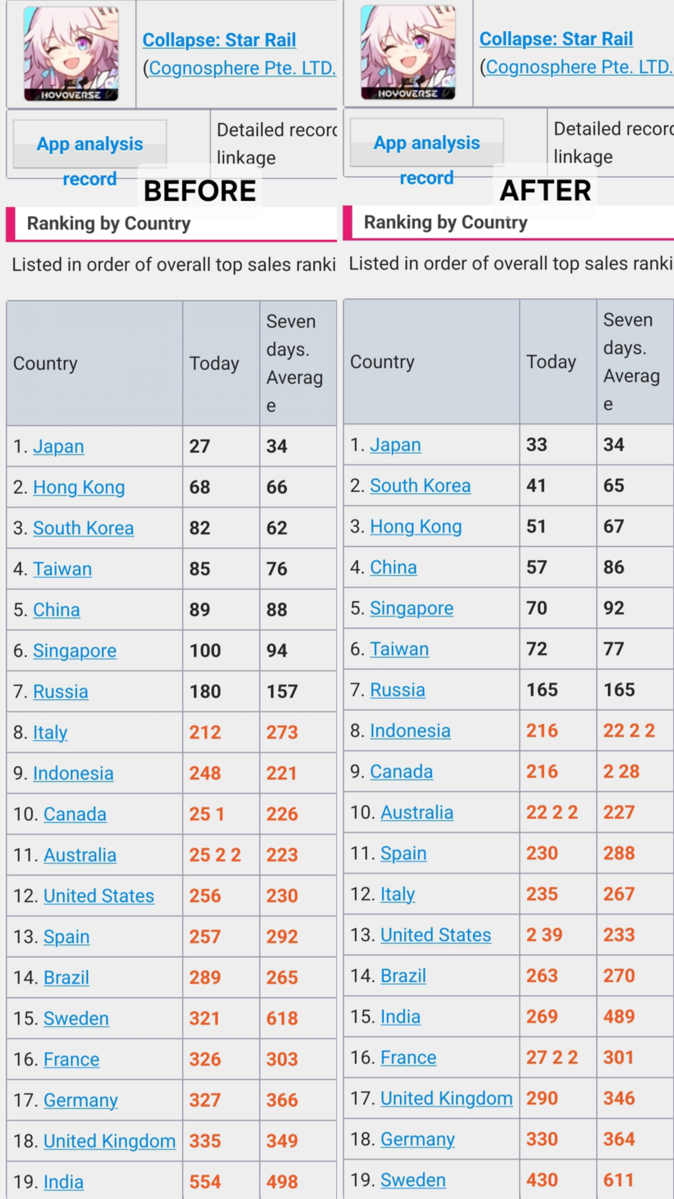 Comparison between HSR rankings before leaks came out 12 hours ago vs now