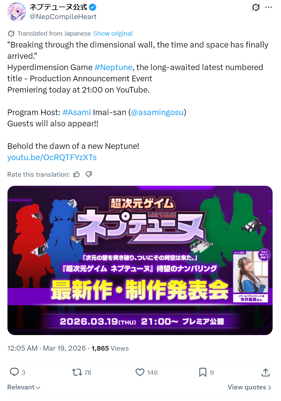Marrying Nepgear EditionPrevious: >>560053229>Upcoming Compile Heart games and release dates:Calamity Angels: Special Delivery (PS4/PS5/Switch) - Out now in Japan, releasing February 2026 in the west. 2026 on PC.Hyperdimension Neptunia Re;Birth 1-3 (PS4) - Out now; released October 28, 2025Madou Monogatari: Fia and the Wondrous Academy (Steam) - Out on Steam, Spring 2026Hyperdimension Neptunia Re;Birth 1 (Switch) (Asia/English) - Out Now on PlayAsiaHyperdimension Neptunia Re;Birth 2 Sisters Generation (Switch) (Asia/English) - Out Now on PlayAsiaHyperdimension Neptunia Re;Birth 3 V Generation (Switch) (Asia/English) - Out Now on PlayAsia.Hyperdevotion Noire: Goddess Black Heart (Switch) (Asia/English) - Spring 2026Ariana and the Elder Codex (PS4/PS5/Switch/PC) - March 24 2026 on consoles, Spring 2026 on PCTokyo Clanpool (Uncut Edition) (PC) - Preorders for physical edition open on Eastasiasoft's shop and on PlayAsia and VGP. GOG patch available on Eastasiasoft's website.Villion: Code (PS4/PS5/Switch/Switch 2) - May 25 in Japan >(don't buy this, it looks absolutely repulsively pozzed. What the fuck, Compa?)New Neptunia mainline - 2026, this time for real guys we swear>Hyperdimension Neptunia Downloads (Skins, Artbooks, Manga, Guides, Soundtracks, etc.):https://rentry.org/rrbfs>Folder containing all the 4koma and Nepnokai raws:https://mega.nz/#F!shkAGDaK!-X8nObRihU5EqP5Zx8yVMA>Patch for Tokyo Clanpool on GOGhttps://www.eastasiasoft.com/tc/TokyoClanpool_PC_Patch.zip
