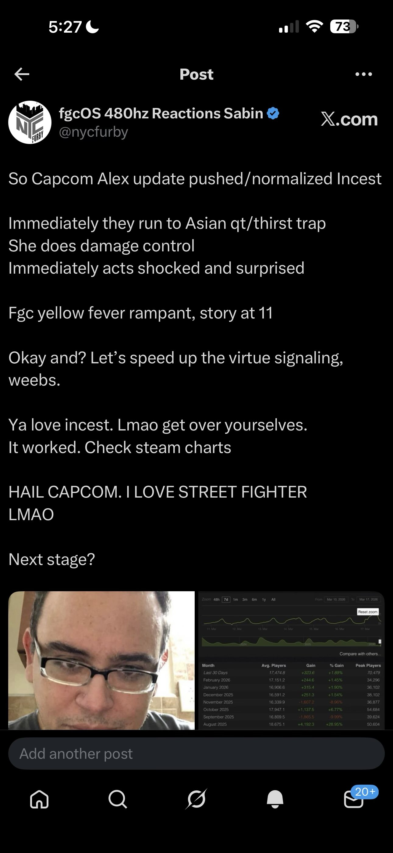 >>560701880NAME ME 6 jappa twitters that are going insane to the degree of western sf fansCuz outside of twitter and on twitch with plenty of japs, most of them either dont care, laugh about it or just say "oh i didnt know that", with the occaional "i wish alex had gill instead..."