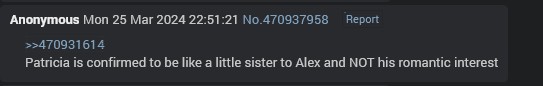 >>560682156alex said this but then patricia took advantage of him one night after a tough wrestling match when he was feeling vulnerable and alex felt it would be dishonorable not to continue to relationship. alex is a hero, remember.
