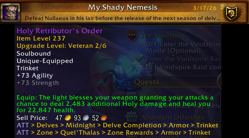 I've got a Lightforged Priest (Holy), a Lightforged Paladin, a Blood Elf Paladin, and a Void Elf Priest (Shadow). I'm really conflicted about which one to play because I enjoy every spec but each character would have different reasons for doing Midnight stuff and honestly, this seems like kind of a weird expansion if you're either holy or void-ish because at some point or another your character would have to do something that they otherwise wouldn't do.
