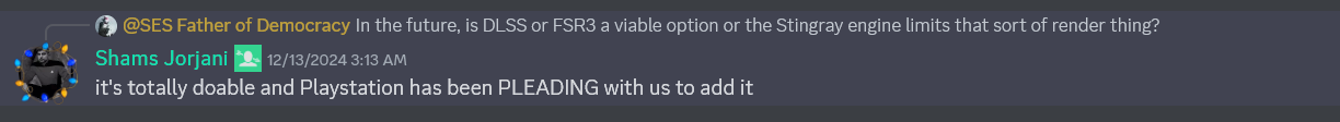 >>560718776>thinking it's Sony stopping themAnon... It's pure Swedish arrogance. They don't want anyone telling them what to do even if it wrong. If Sony really controlled them, they would've put in DLSS a year ago.