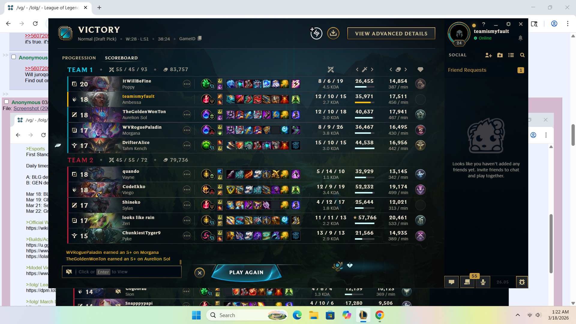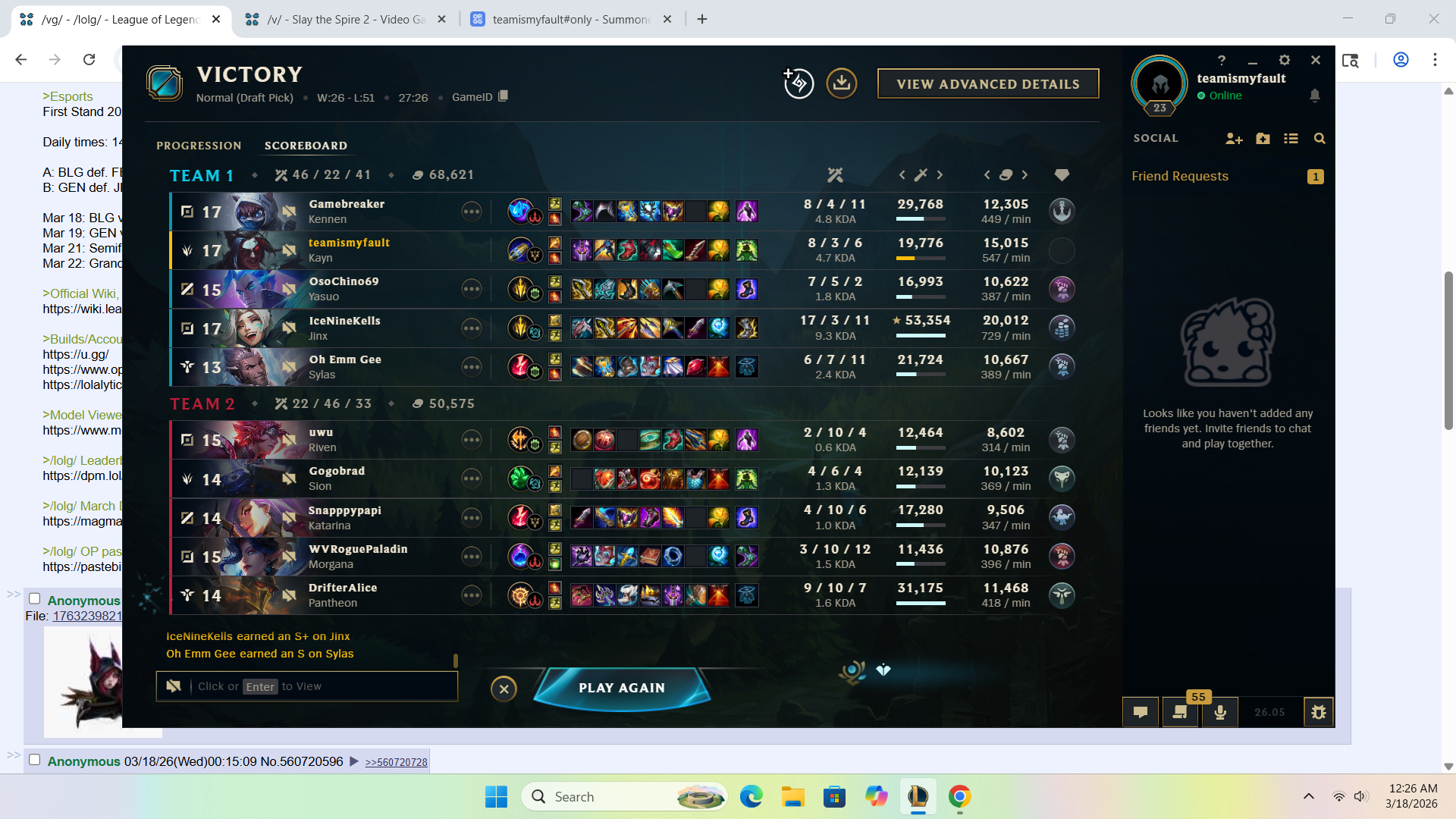 Previous: >>560649616>Current & Upcoming ContentPatch 26.06 (Mar 18, 2026) liveSeason 2026 - Season 1: "For Demacia"(https://www.leagueoflegends.com/en-us/news/game-updates/league-of-legends-patch-26-6-notes/)Shyvana's VGU has been released!New skins: Warhound Naafiri, Warhound Senna, Warhound WarwickWarhound Senna is a rev-share skin (portion goes to LoL Esports teams)ARAM: Mayhem extended indefinitelyPatch 26.07 - Apr 1, 2026 (April Fools: Bubble Bash Blitzcrank, Fried Chicken King Swain,Pug Trainer Sejuani, Choncc Kench, Surprise Party Vex, Prestige Money Miser Mordekaiser)Patch 26.08 - Apr 15, 2026Next new champion delayed until Season 2 (expected May 2026)Riot focusing on MSI patch and balance updates first>EsportsFirst Stand 2026 - Mar 16-22 (São Paulo, Brazil)Daily times: 14:00 & 19:00 CET / 09:00 & 14:00 ETA: BLG def. FEX 3-2 / G2 def. TSW 3-0B: GEN def. JDG 3-0 / LYON def. LOUD 3-2Mar 18: BLG vs G2 / FEX vs TSW (elim.)Mar 19: GEN vs LYON / JDG vs LOUD (elim.)Mar 21: SemifinalsMar 22: Grand Final>Official Wiki, Patch Notes and PBEhttps://wiki.leagueoflegends.com/en-us/>Builds/Account Statshttps://u.gg/https://www.op.gg/https://lolalytics.com/>Model Viewerhttps://www.modelviewer.lol>/lolg/ Leaderboardhttps://dpm.lol/leaderboards/2f32736c-e08f-4f2b-aae6-3f3326cabd9b>/lolg/ March Drawpilehttps://magma.com/d/ic7qIEWtEJ>/lolg/ OP pastebinhttps://pastebin.com/EXfS6uXB