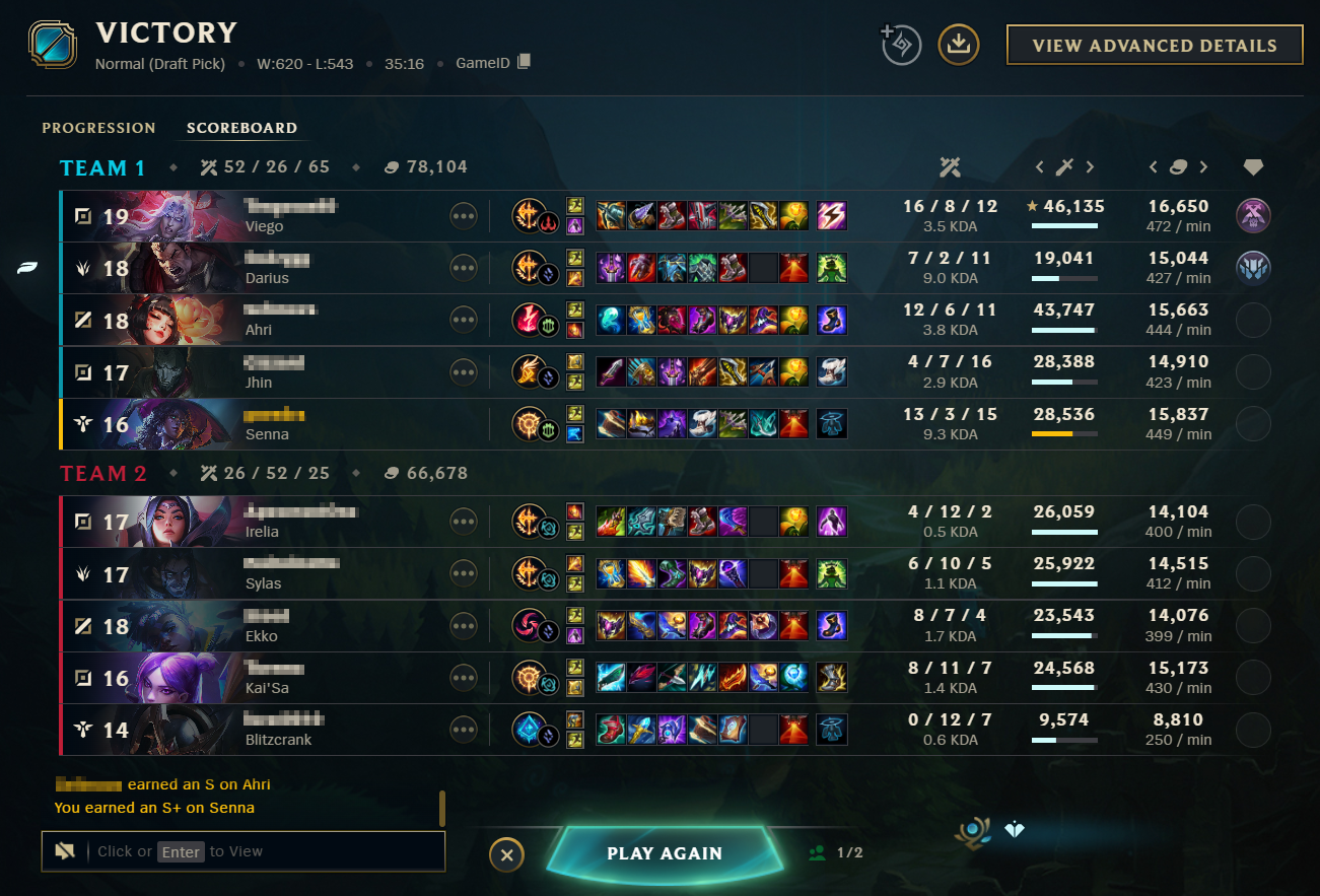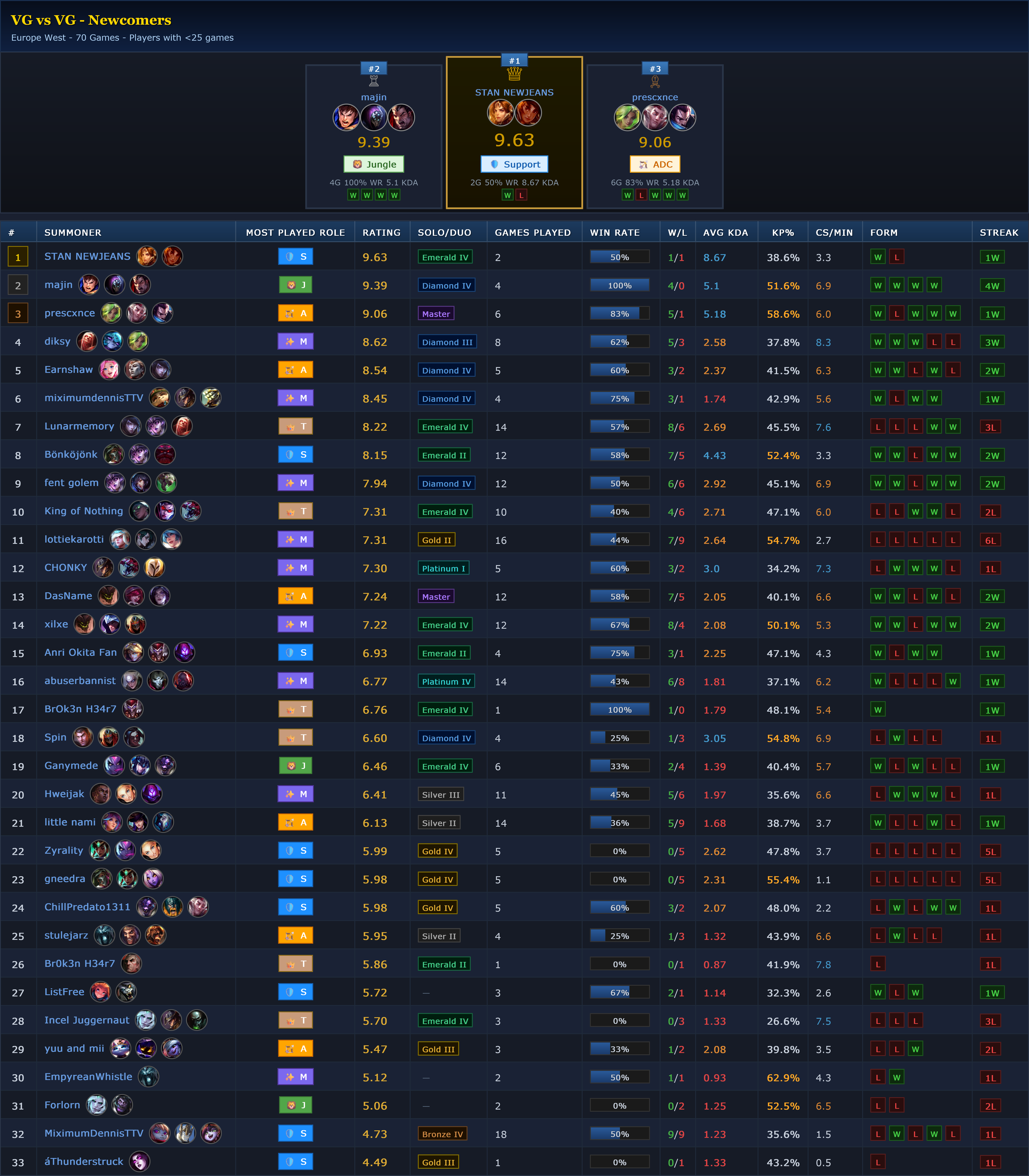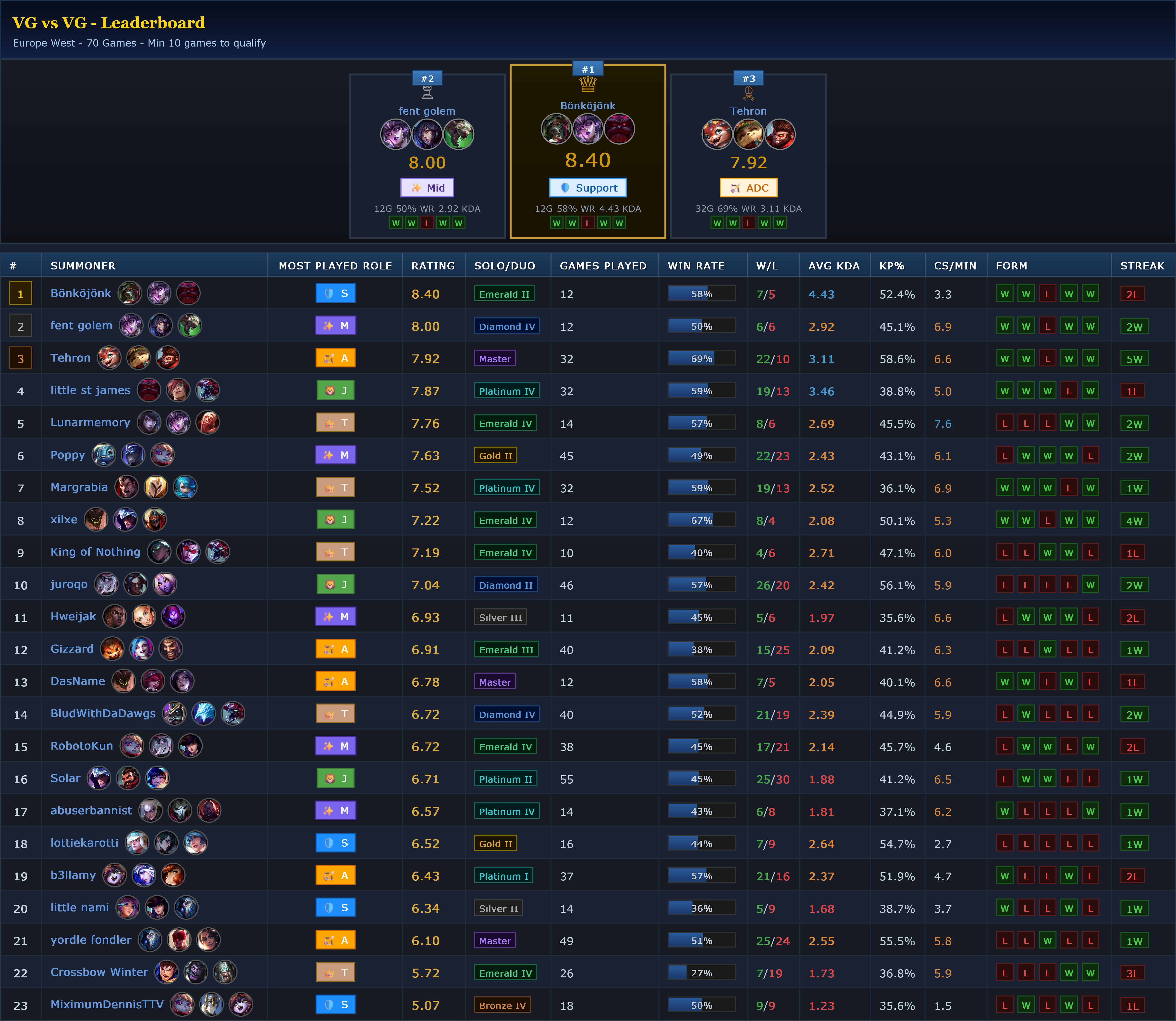 >>560722920>>5607232912 different leaderboards by the way.The first one is the one I will keep using since it has better stats, in the future I will also track vision score, damage dealt etc. (future meaning this week)the second one is kinda the shit one that only tracks the bare minimum W/L, KP, KDA etc. but this will be used to give out the 20€ RP giftcard, since other stats havent been tracked yet it'll be unfair to use the other leaderboardIn the season 2 of euwvgs I will be using the better and more detailed leaderboard only from now on (Thursday) I will be keeping track of all the stats and they will feed into both leaderboards until the 03.05 where I will get rid of older games up to that point (even the first leaderboad) and making a new leaderboard with only properly tracked games. >>560723667second leaderboard tracks all the games played.