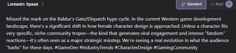>>560770667Yeah but women and estrogenized males can't handle banter, and those "people" make up the majority of skin sales, so...