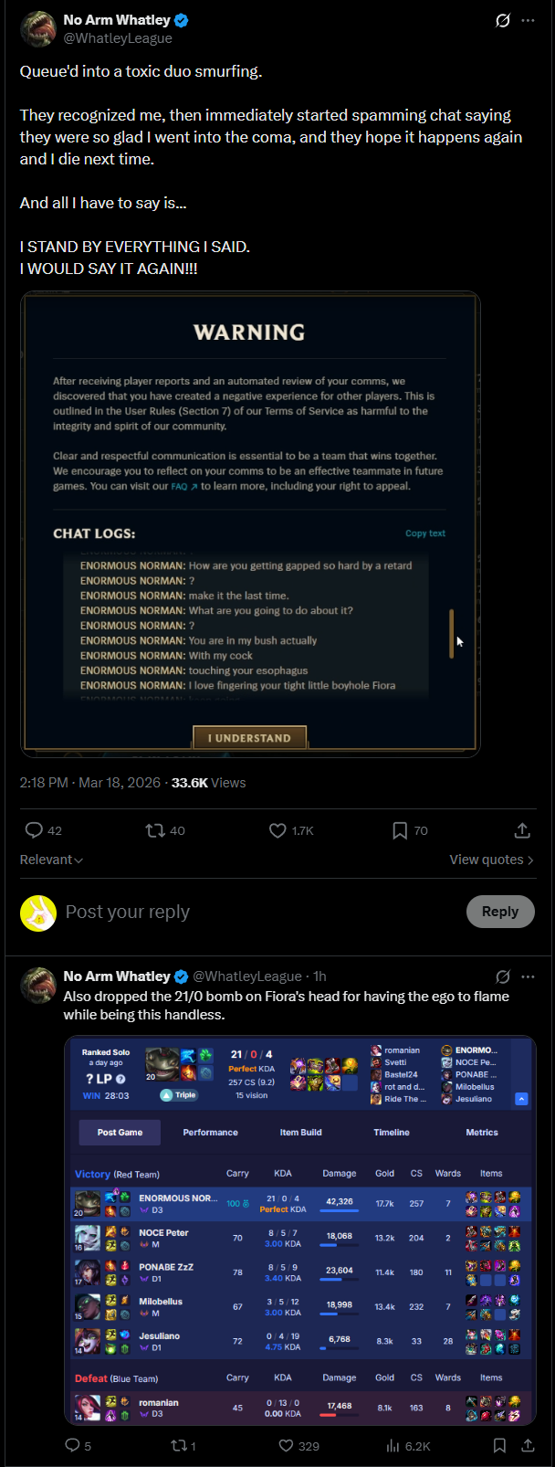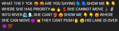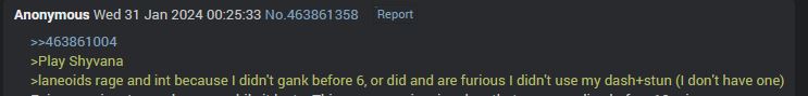 >>560770145>chimps out in chat in big 2026One of the appealing parts of playing a multiplayer game for most people is the fact that it's a MULTIPLAYER game and you're playing and interacting with other people despite how much Riot and other modern gaming companies try to clamp down on socialization. Typing is fun. Banter is fun. Even chat toxicity is fun. It's just gameplay toxicity that's a real problem as it throws games off, obviously.