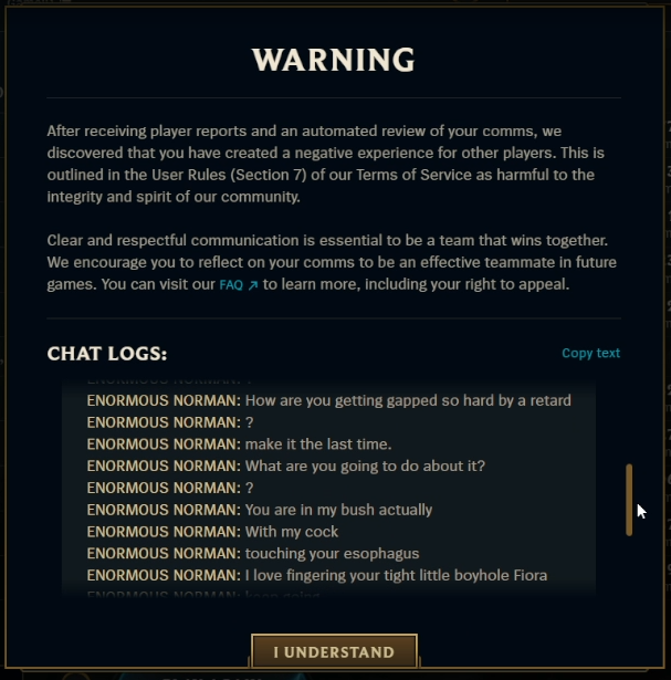>wahh wahh riot why did you warn me I want to spam all chat with my gay fantasies about enemy fiora waaaaaaaahYOU are the faggot in the meaning of the word, tardie, either come out of the closet or sybau