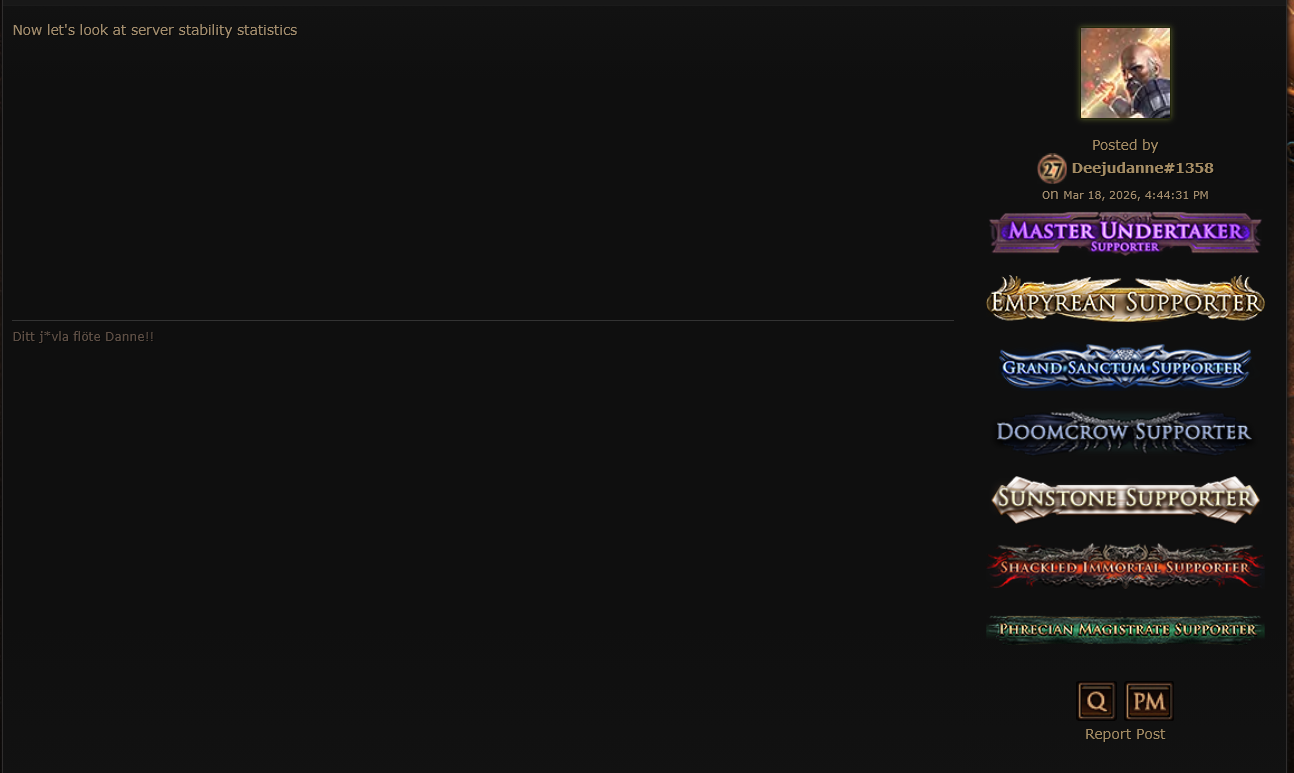 Last night after deploying 3.28.0c, some of our servers accidentally had their configuration broken in a way that resulted in approximately twice the number of players being assigned to some servers than what they can normally handle. This was entirely an error on our part and doesn’t have anything to do with previous server disruptions that we have had this launch.Unfortunately, even though we have an alerting system in place to wake up our server admins in cases where load on our servers is too high, none of the conditions we had in place were triggered by this event. There are some unusual properties of this incident that we are still investigating that caused performance to be bad even though CPU load was not higher than our alerting threshold.As soon as our server admins were made aware of the problem, the configuration issue was able to be immediately resolved, but this resulted in around 12 hours of degraded performance for some users in some regions.We have added some new performance metrics to our alerting system which will make sure that this particular failure doesn’t happen again.We apologise for the impact that this had. This incident was our fault, and we will make sure that it doesn’t happen again.https://www.reddit.com/r/pathofexile/comments/1rxkq1o/an_update_on_server_performance_after_the_3280c/
