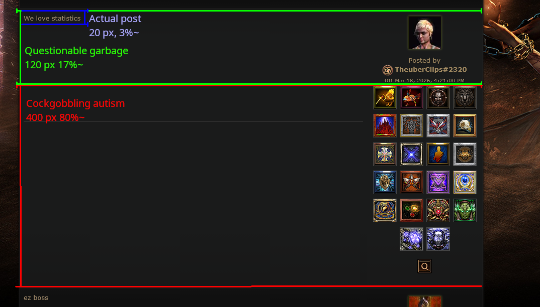 >>560789771>Pretty sure there's a website for that to compare the chaos:dust ratiohttps://disenchant.easyexile.tools/>>560789706Not necessarily. I find myself dumping most unique items that I find since I don't consider it a main part of my gameplay. >>560790107Add www.pathofexile.com##.badges to your block list.