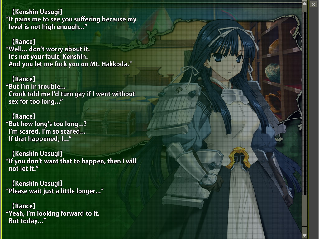 Btw my head canon reason for why he loves Sill is that since genuine emotion freaks him out (at least until around Rance IX), the transactional nature of the slave master relationship allows him to keep a women around that has a logical pretext, so he can let his guard down around her and that became love over time. At the same time, what Rance feels as love is different from a normal person. That stuff is all well and good, but that is why Rance likes her, not why the player would. The main reason for the player is just "well, she's important to Rance", which works from a gameplay perspective, but isn't effective emotionally for a lot of people (except for fujos who eat that shit up).