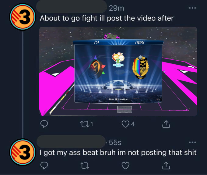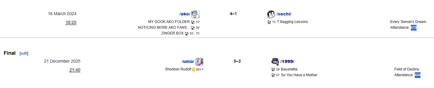 Previous: >>560552248>What... is this?Put simply, a simulation of Pro Evolution Soccer being competed between teams which are embodiments of boards of the 4chan imageboard. The players represent facets of each board's culture. All of the matches are AI versus AI. However, humans "manage" each team, creating their tactics and giving input during games as they happen to make substitutions and tactical changes as they see fit.https://implyingrigged.info/wiki/FAQ>Where can I watch the cup?https://isthisliv.com/4cc/stream.html>Ongoing Invitationalshttps://implyingrigged.info/wiki/2026_4chan_Spring_Friendlies>Upcoming Cupshttps://implyingrigged.info/wiki/2026_4chan_Spring_Babby_Cuphttps://implyingrigged.info/wiki/2026_4chan_Summer_Cup>Upcoming Invitationalshttps://implyingrigged.info/wiki//vg/_League_26_Enemylieshttps://implyingrigged.info/wiki/Very_Genuine_and_Legit_Vidya_Game_Leaguehttps://implyingrigged.info/wiki/Test_Cup_V_18.1https://implyingrigged.info/wiki/2026_4CC_Champions_Leaguehttps://implyingrigged.info/wiki//ag/_League_9/11:_Never_Forgethttps://implyingrigged.info/wiki/Beta_Bowl_4>Wiki:https://implyingrigged.info/wiki/Main_Page>Sekkrit Code37pebis>DLC Passworddivegrass>Booruhttps://isthisliv.com/booru/>Archivehttps://implying.fun/>Other videoshttps://implyingrigged.info/wiki/Videos>PES Infohttps://implyingrigged.info/wiki/Pro_Evolution_Soccer_2015https://implyingrigged.info/wiki/Pro_Evolution_Soccer_2021>PreviouslyEnemylies are filling upIs 4CC ded?>effort/trick/posting/1999/postingSangenpostingRapepostingBreedpostingShitposting