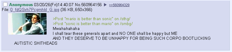 >See retarded argument about Sonic ("Mario is or isn't better than Sonic") on /smbg/ of all places>Notice the inverse isn't happening; no Mario argument on /sthg/, not even a single mention of Mario. >Decide to mention Mario in /sthg/, then stir the pot a little and post this on /kdg/>/smbg/ immediately notices and starts pointing fingers at people saying one of them is "the /kdg/ schizo" (I was just on /smbg/ the whole time) who "shills for sonic" (the only good sonic game is Sonic Mania and maybe SA1) and "complains about corpos" (yeah corpos are retarded)Oh how the generals on this site are quick to collapse into civil war all the time. Isn't it funny?
