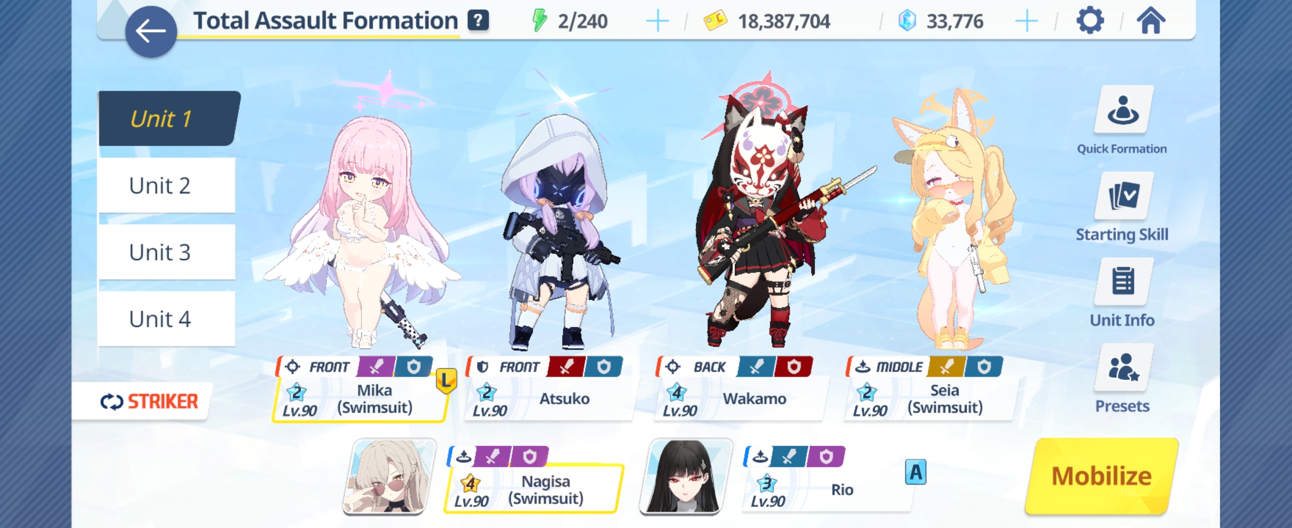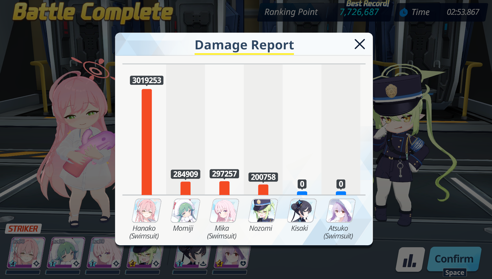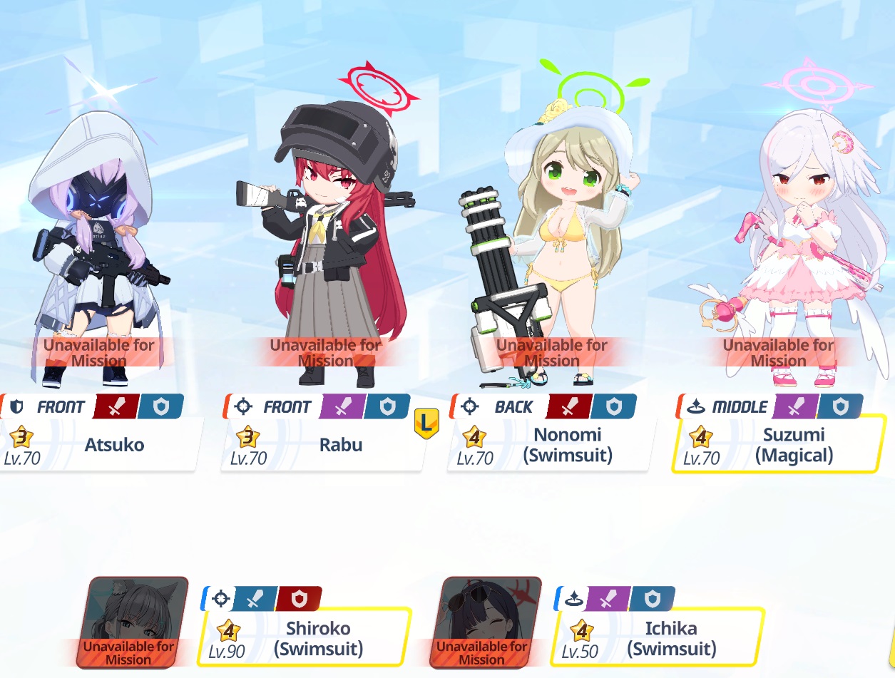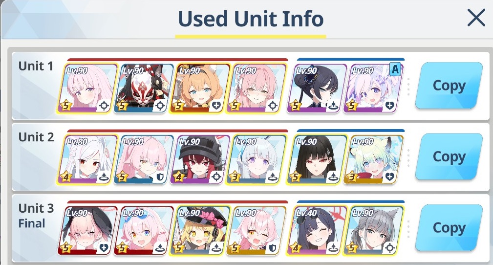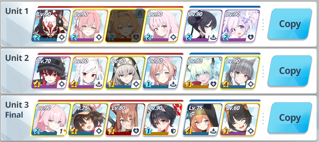This is my team 2 >>560817007Hard for me to do phase 1, so it's hard to test phase 2 directly.I could make a third team probably. I have some focus and CC, though I'm getting tired, so it's hard for me to think how to split them between teams 2 and 3.I already use sHanako(Assist), sMika, Koharu, sSeia, Rio, sNagi on team 1.