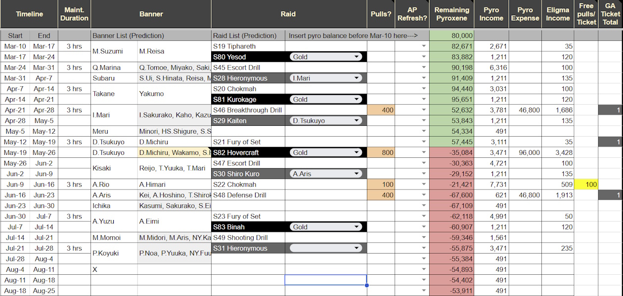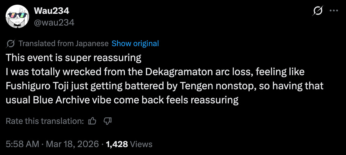 Previous Thread: >>560789992>Guides, Resources and useful links:https://rentry.org/bagguides>/bag/Circles/Clubs/Friends:https://rentry.org/holdingthebag>4koma, Manga, Side Content, PVs & Shortshttps://rentry.org/bacontent>>(JP) – JST>Banners:>18/3 After Maint – 4/1 10:59KonokaRena>News:Patch notes: https://bluearchive.jp/news/newsJump/642>Events:Kivotos Unsolved Mysteries: The Great Tsuchinoko Investigation to Ward Off Evil – 18/3 After Maint – 4/1 10:59>Content:Total Assault: Goz (Field) – 3/25 11:00 – 4/1 3:59Limit Break Assault: Tiphareth (Indoor – w/Elastic Armor) – 3/19 11:00 – 4/21 3:592x Bounty – 3/18 4:00 – 3/25 3:592x Account EXP – 3/20 4:00 – 3/23 3:592x Normal – 3/25 4:00 – 4/1 3:592x Account EXP – 3/28 4:00 – 3/30 3:592x Lesson/Scrimmage – 4/1 4:00 – 4/8 3:592x Hard – 4// 4:00 – 4/15 3:592x Commissions/Bounty – 4/15 4:00 – 4/21 3:59>>(GLOBAL) – UTC>Banners:>3/10 After Maint – 3/24 1:59Suzumi (Magical – Limited)Reisa (Magical – Limited)Rabu (Welfare)>News:Coupons: MAGICALVIGILANTE / BOLTCATCH831 / HEAVYCALIBER310 – 3/10 9:00 – 3/24 1:59Coupon Guide: https://rentry.org/CouponBAPatch notes: https://forum.nexon.com/bluearchive-en/board_view?thread=3393151Roadmap: https://bluearchive.nexon.com/events/2026/03/update>Events:Magical Girl Heavy Caliber: Era's Ambitions and the Qualifications of Justice – 3/10 After Maint – 3/24 1:59My Office: https://bluearchive.nexon.com/user/myoffice>Content:Total Assault: Yesod (Urban) – 3/17 2:00 – 3/23 18:59Limit Break Assault: Tiphareth (Indoor – w/Elastic Armor) – 3/11 2:00 – 4/6 18:592x Commissions – 3/16 19:00 – 3/23 18:592x Account EXP – 3/20 19:00 – 3/22 18:592x Lesson/Scrimmage – 3/23 19:00 – 3/30 18:592x Normal – 3/30 19:00 – 4/3 18:59