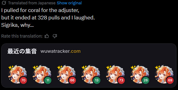 >>560827719No it should be much more than that. Every 80 pulls gives you 18 corals, so that's already 90 corals. Every 10 between that is at least 3, more if you get character dupes or 2 weapons etc, should be another 120 even if you are unluckly.