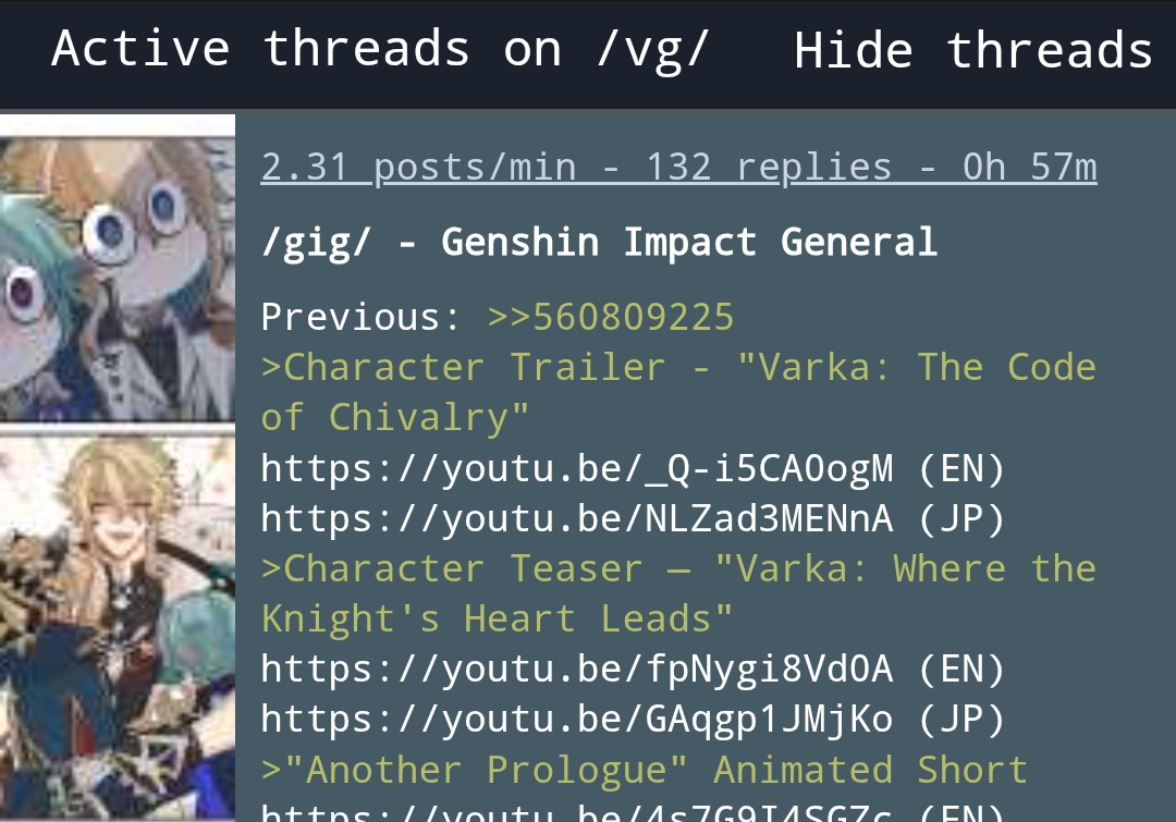 Previous: >>560809225>Character Trailer - "Varka: The Code of Chivalry"https://youtu.be/_Q-i5CA0ogM (EN)https://youtu.be/NLZad3MENnA (JP)>Character Teaser — "Varka: Where the Knight's Heart Leads"https://youtu.be/fpNygi8Vd0A (EN)https://youtu.be/GAqgp1JMjKo (JP)>"Another Prologue" Animated Shorthttps://youtu.be/4s7G9I4SGZc (EN)https://youtu.be/waZgLGxJN6E (JP)>Version "Luna V" "Homeward, He Who Caught the Wind" Trailerhttps://youtu.be/p02WXZZ84M4 (EN)https://youtu.be/V30u55XoYrE (JP)>Current character banner: Varka, Flins, Sucrose, Xiangling, Bennett>Current weapon banner: Gest of the Mighty Wolf (Claymore), Bloodsoaked Ruins (Polearm)https://www.hoyolab.com/article/43911910>Daily check-in rewards (permanent)https://webstatic-sea.mihoyo.com/ys/event/signin-sea/index.html?act_id=e202102251931481&lang=en-us>Redeemable Codes with Primogems (all regions): https://genshin.mihoyo.com/en/giftGENSHINGIFT8BHA0KFRG94K8X73KH58KDHNLTT3DVKVLUQZ>Useful Links (Wiki, Simulators, Maps, Character Builds, /gig/ friendlist, Third-Party Tools, etc.)https://rentry.org/giglinks/gig/ OP pastebin (use this if making new thread):https://pastebin.com/ca0zseQ9