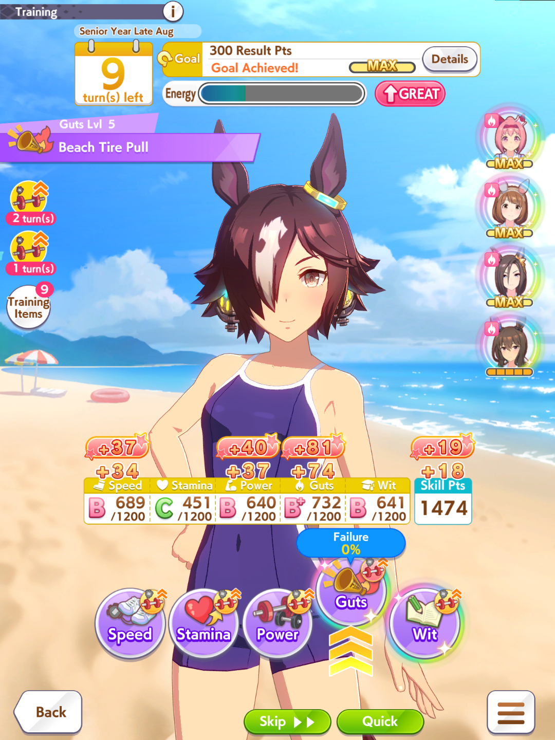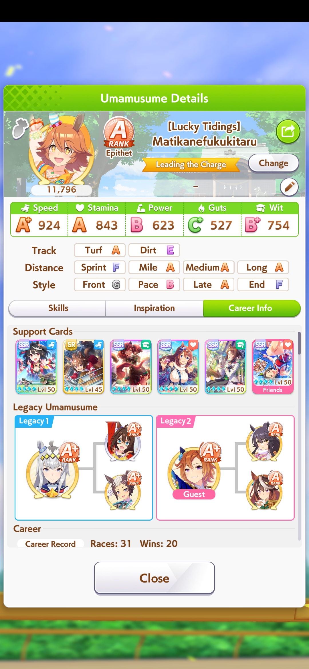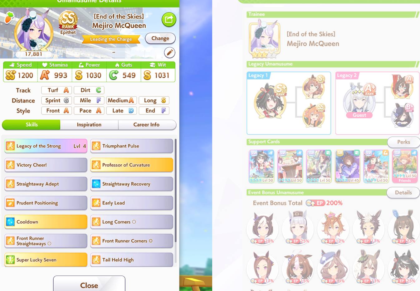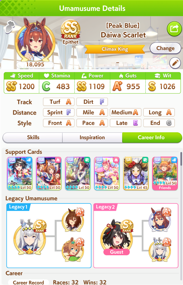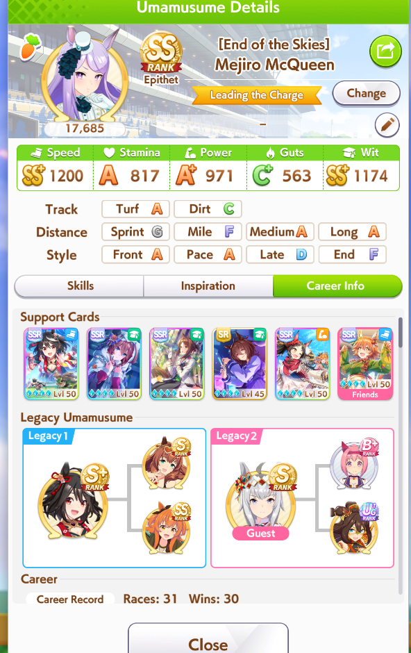 Current Rate Up Support Cards: SSR Narita Top Road (Speed), SR Admire Vega (Guts), SR Mejiro Ryan (Stamina), SR Bakushin (Power)