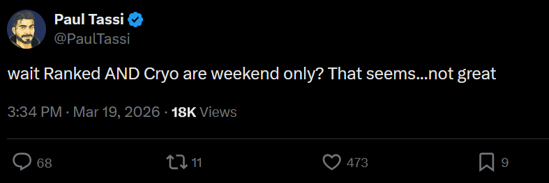 >>560876512plebbit is pretty split on it, mostly for the "weekends only thing"the "we have to protect the loot economy" excuse isn't really being accepted since what that basically means is "you can you only play this content on weekends or else try hard streamers would get too much gold loot in the first week"