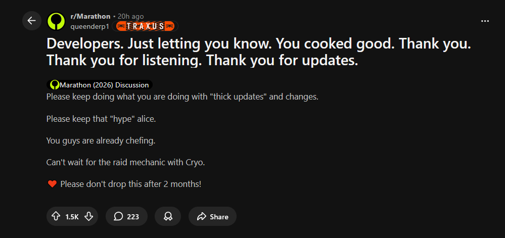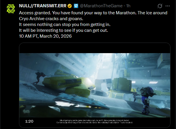 Tiny Rook Edition>Game Info:https://store.steampowered.com/app/3065800/Marathon/>Marathon Game Home Pagehttps://www.marathonthegame.com/>The Entire History of Marathonhttps://www.youtube.com/watch?v=yu7uN6-lNhkhttps://marathon.bungie.org/story/>Play the Original Marathon for Freehttps://store.steampowered.com/app/2398450/Classic_Marathon/Databases:https://tauceti.world/https://tauceti.gg/https://marathonmeta.gg/https://marathondb.gg//vg/ Discord:https://discord.gg/RDy8sPCeKcNews:>RECENT PATCH NOTEShttps://www.bungie.net/7/en/News/Article/marathon_update_1_0_5>SEASONS & ROADMAPhttps://www.bungie.net/7/en/News/Article/introducing_seasons_marathon>MARATHON OST VOL. I & II OUThttps://music.youtube.com/playlist?list=OLAK5uy_n3mqJXB_rxXOGplviv8tGdXtHDdL9grK4https://music.youtube.com/playlist?list=OLAK5uy_k_FhqMdjI4UChXwooy0VROM84xgCi8JM0>BATTLEPASS UPDATEDhttps://www.youtube.com/shorts/xnRC9IxTkJo>RANKED DETAILShttps://x.com/TauCetiGG/status/2033929468713308638>CRYO ARCHIVE DETAILShttps://tauceti.gg/articles/marathon-cryo-archive-unlock-requirements>CRYO ARCHIVE BOT KILL REQUIREMENT TRACKERhttps://marathon.winnower.garden/cryoarchivePrevious Run: >>560796136