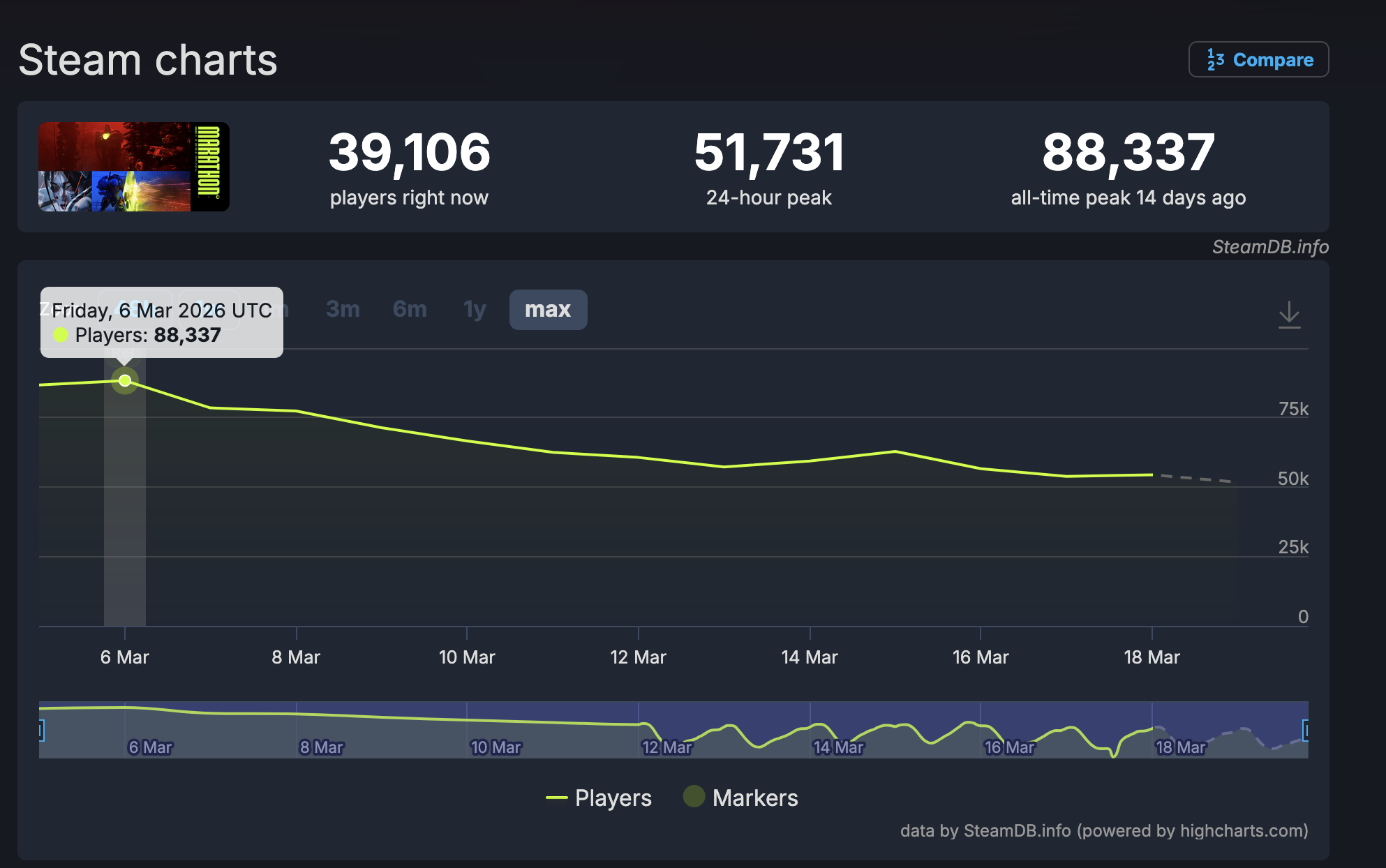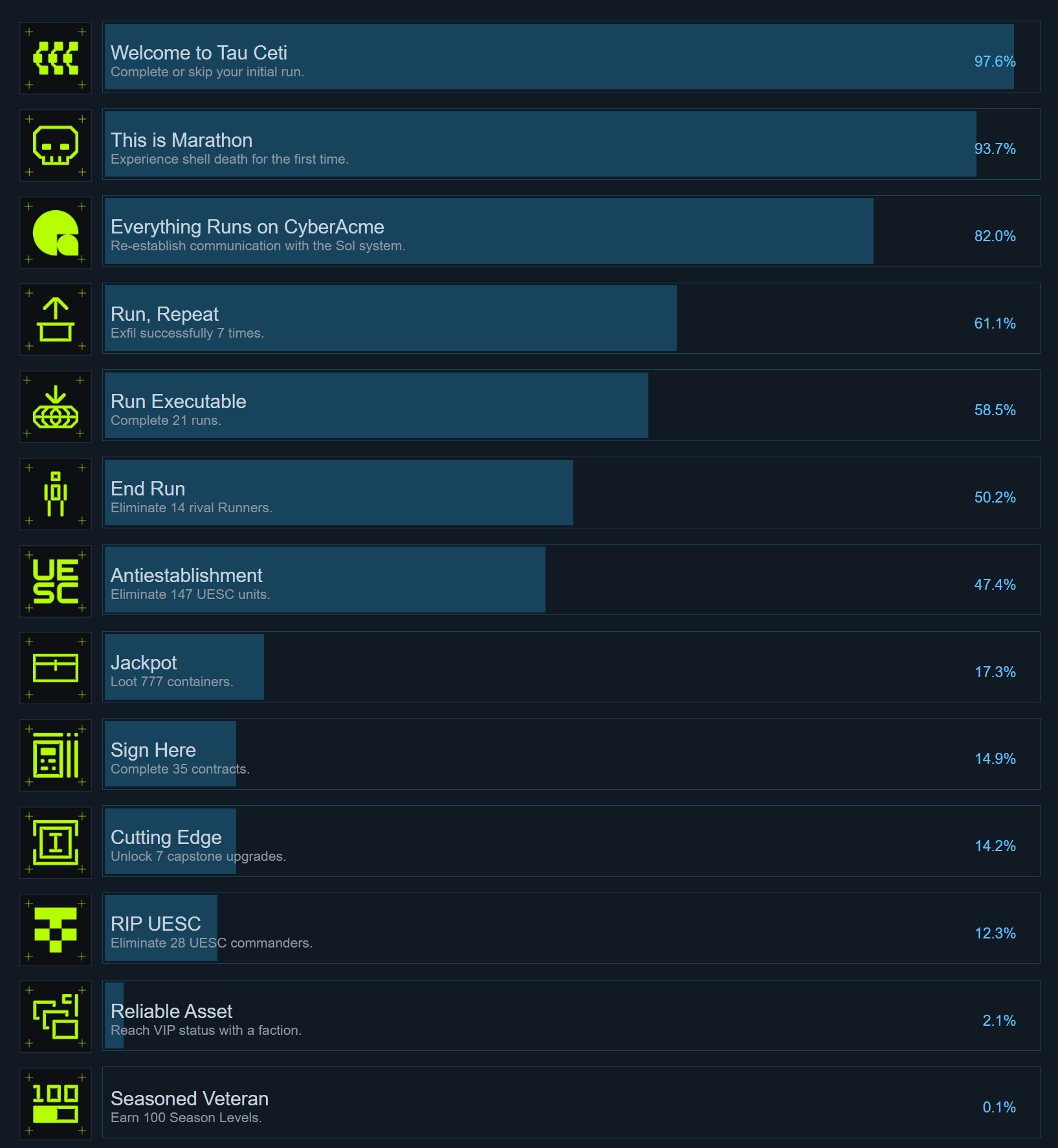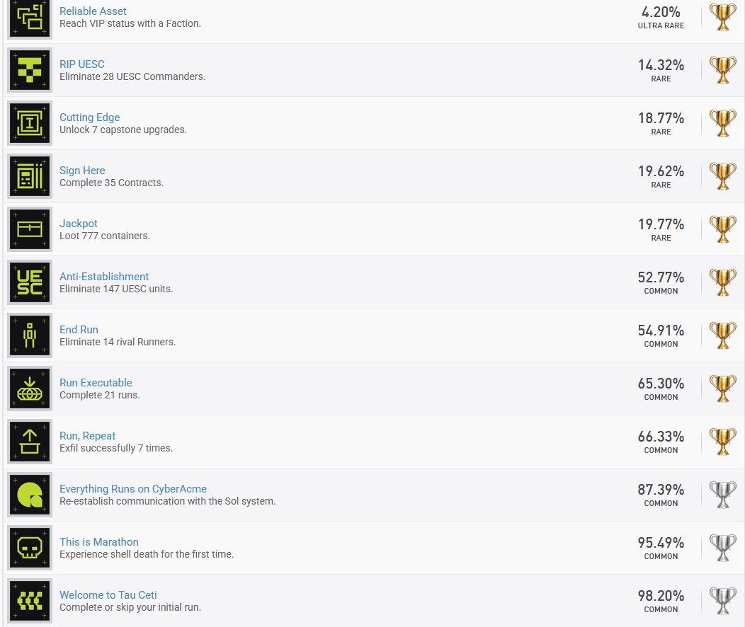 >>560876769https://psnprofiles.com/trophies/40178-marathon?order=rarity% seem marginally better on PS. Haven't found a public tracker for Xbox though so that's still in the wind. Please share how you're getting the xbox achievement rate to calculate that its 50% of all players have never exfiled once.>>560876973If I offered you 50% off something, then you found out I'm only discounting it by 40%, would you accept that?