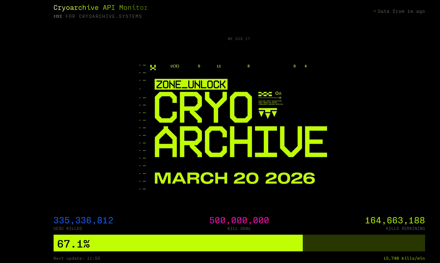 >cryo archive bot kill tracker: 9 days left>ingame timer: 19h leftuh oh lol they definitely assumed wed kill those bots faster